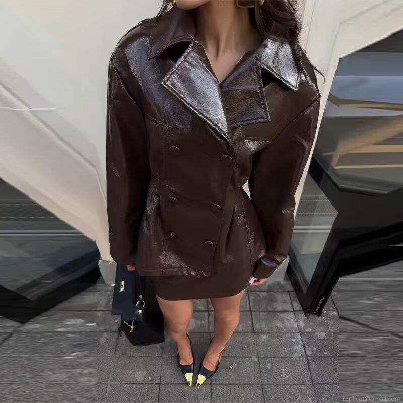 Solid Color, Waist-cinching Design, Double-breasted, Button Decoration, Glossy Patent Leather