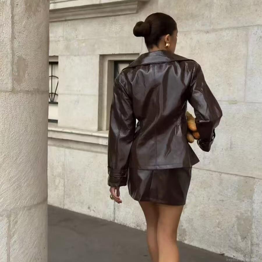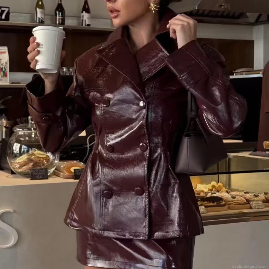 • Women's Sexy PU Leather Two Piece Skirt Set Double Breasted Shiny Lapel Jacket and High Waist A-Line Mini Skirt Outfits For Party Clubwear Night Out