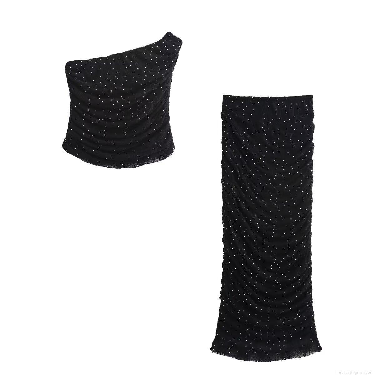 • Women's Sexy Ruched One Shoulder Top And Rhinestone Long Skirt Set Elegant Two Piece Clubwear Party Outfit For Ladies