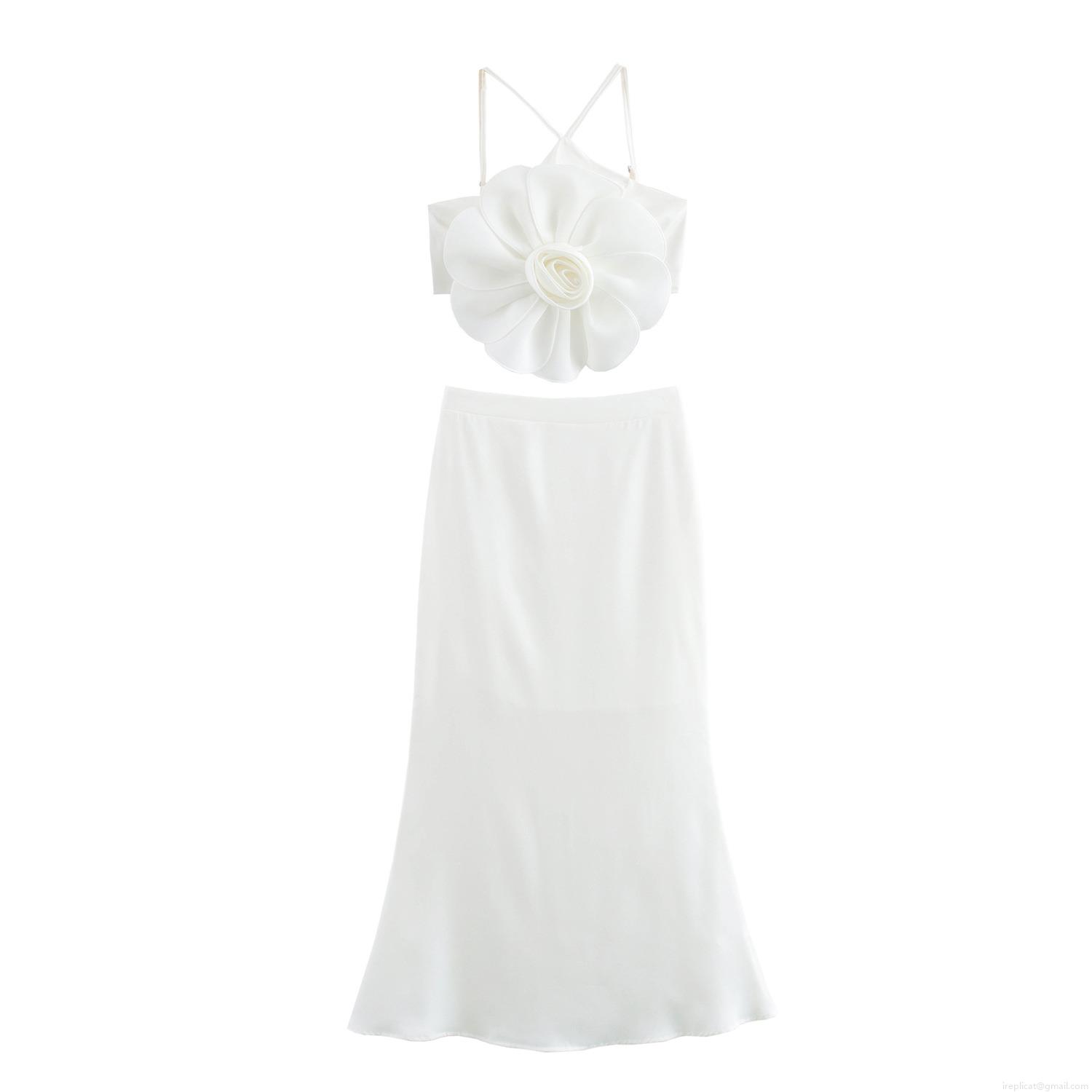 • Women's Sexy Two Piece Set White 3D Flower Cami Top And Elegant Maxi Fishtail Skirt For Party Evening Clubwear Wedding Guest Outfits