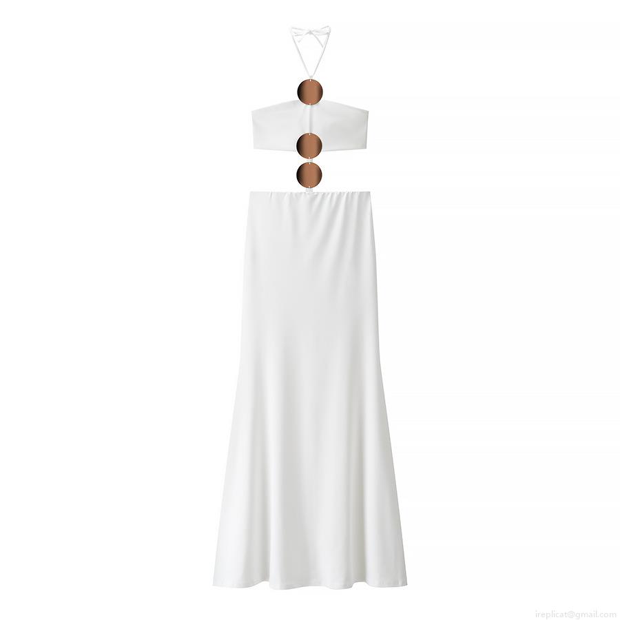 • Women's Sexy Two Piece Skirt Set Halter Neck Crop Top and Long Maxi Skirt Solid Color Polyester with Metal Circle Decor for Summer Vacation Beach Clubwear