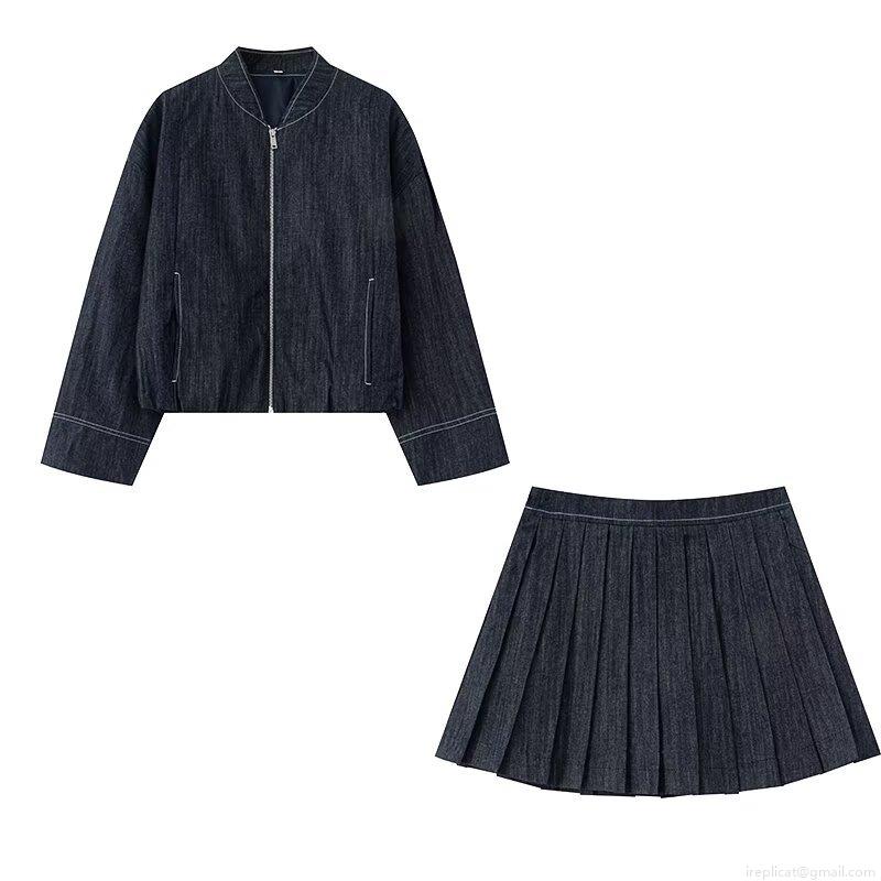 • Women's Street Style Denim Jacket and Pleated Skirt Set Cotton Blend Short Zipper Bomber Jacket and High Waist Mini Pleated Skirt Two Piece Outfits Casual Daily Streetwear Clothes