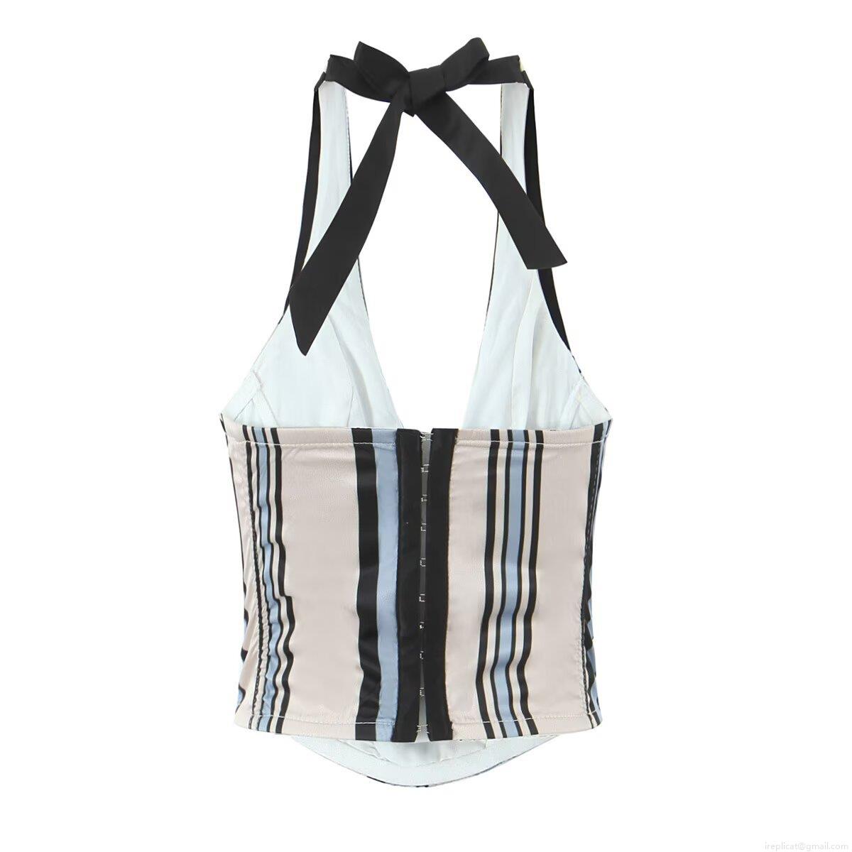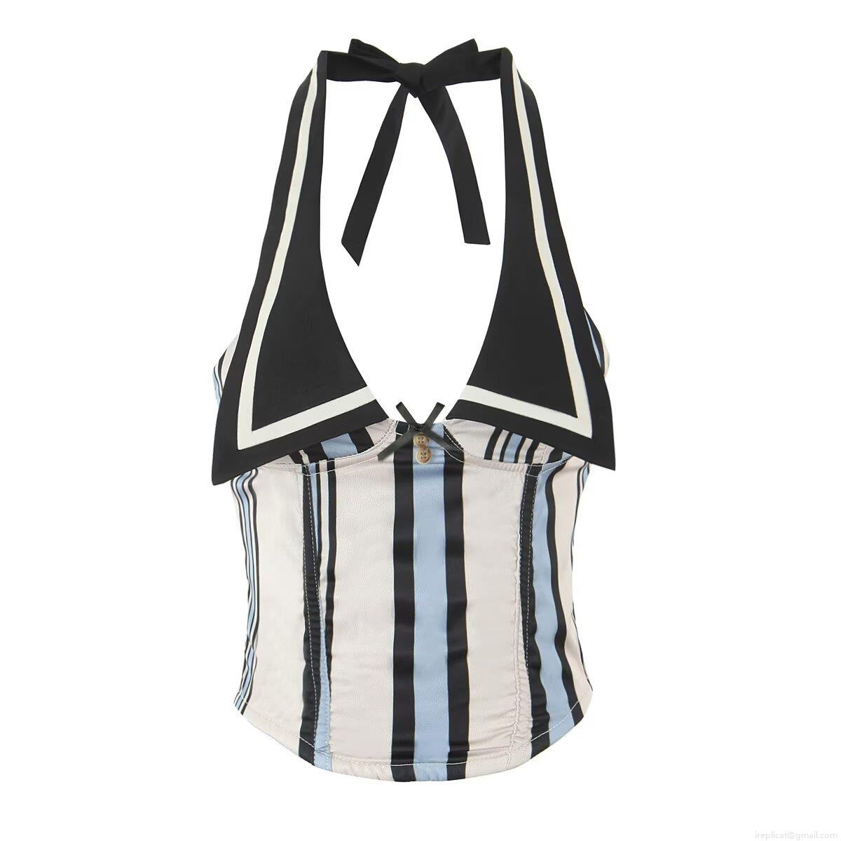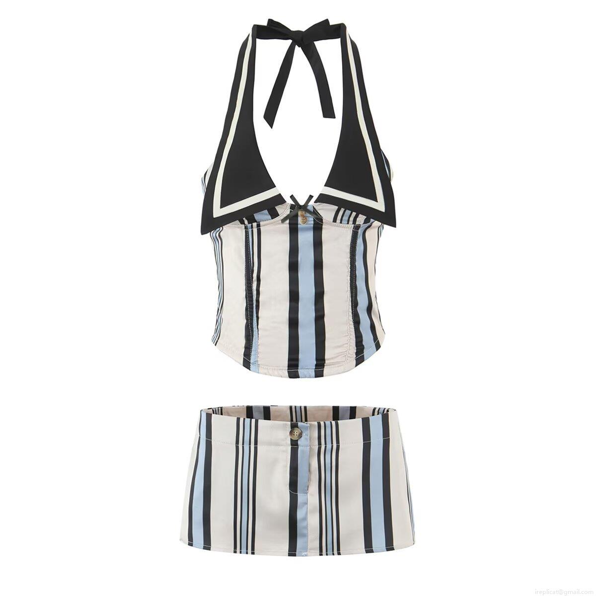 Women's Striped Halter Top And Mini Skirt Two Piece Set 2025 Summer European Street Style Contrast Color Polyester Outfits Casual Short Vest Skirt Set For Women