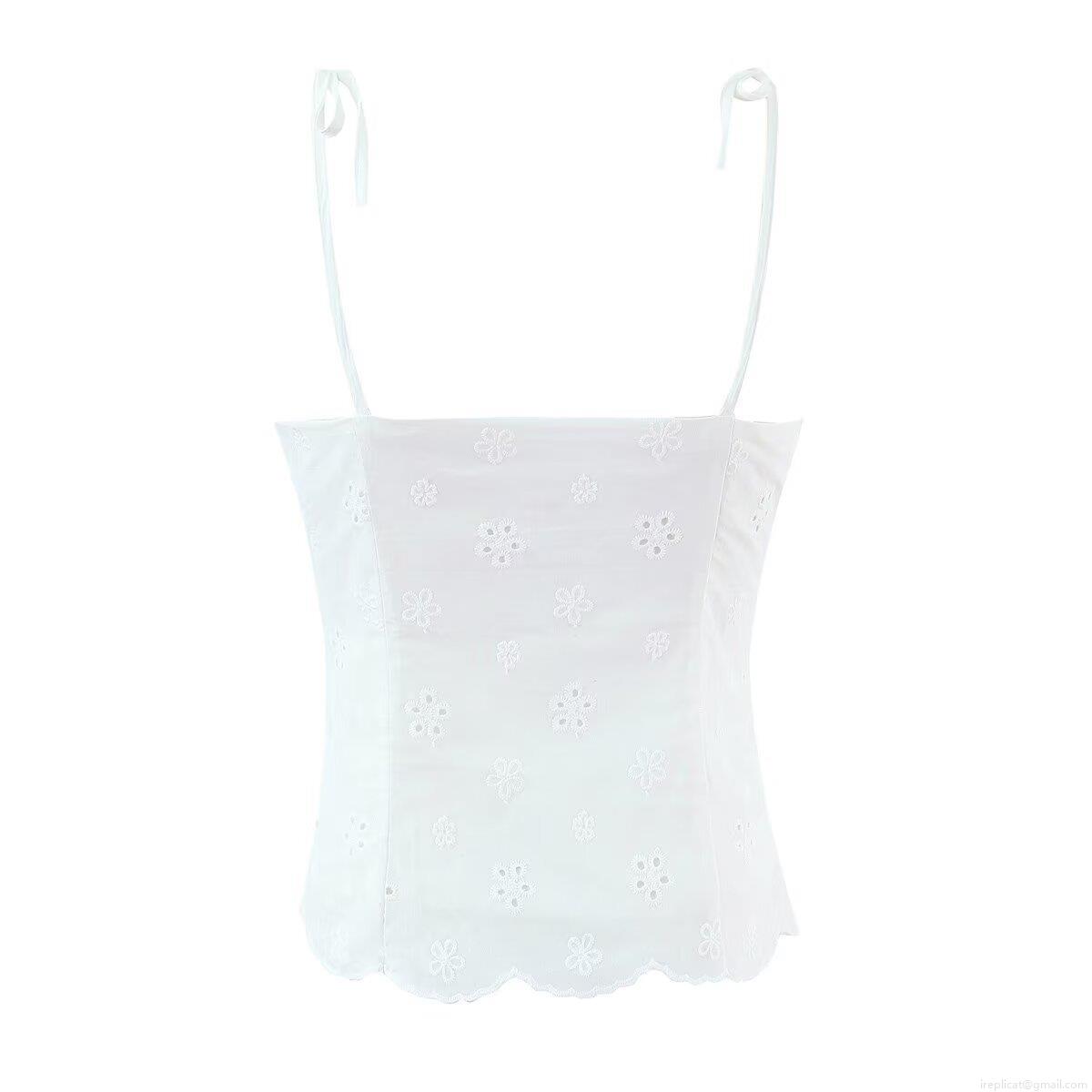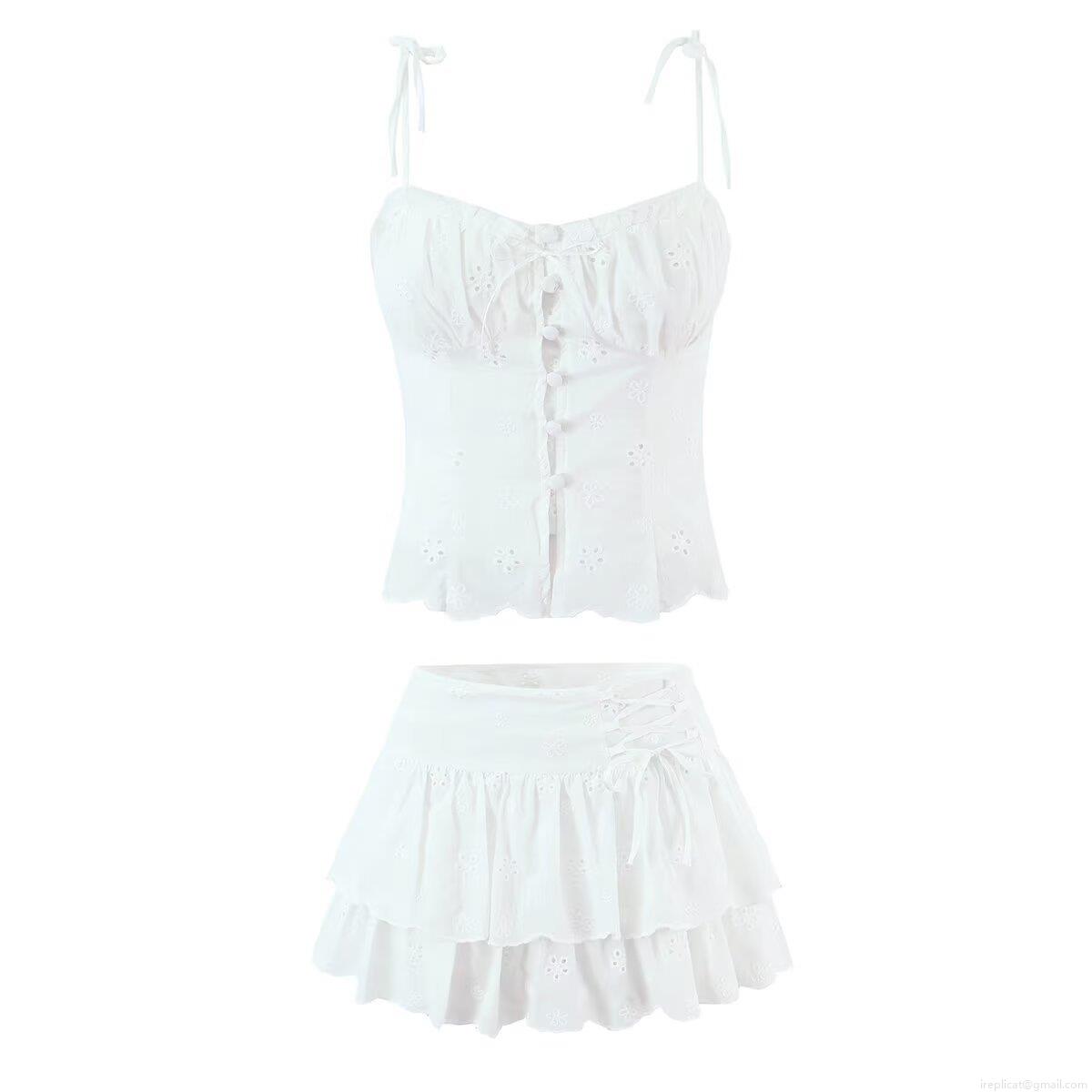 • Women's Summer 100% Cotton Eyelet Embroidery Two Piece Set Lace-up Camisole Top And Ruffle Mini Skirt Fashion Casual White Beach Vacation Outfits