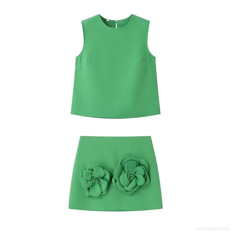 • Women's Summer 2 Piece Skirt Set 3D Camellia Flower Decor Sleeveless Round Neck Vest Top Mini Skirt Fashion Streetwear Co-ords