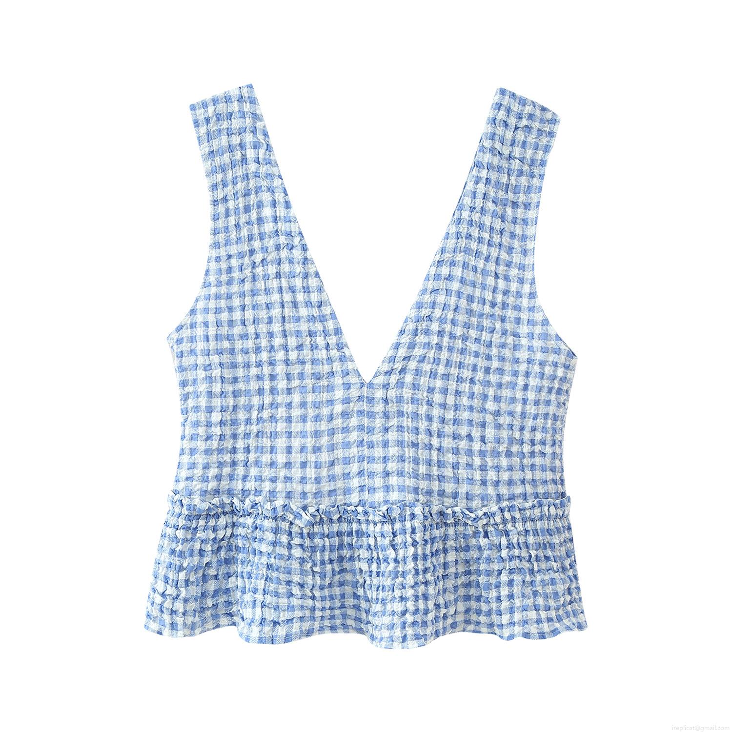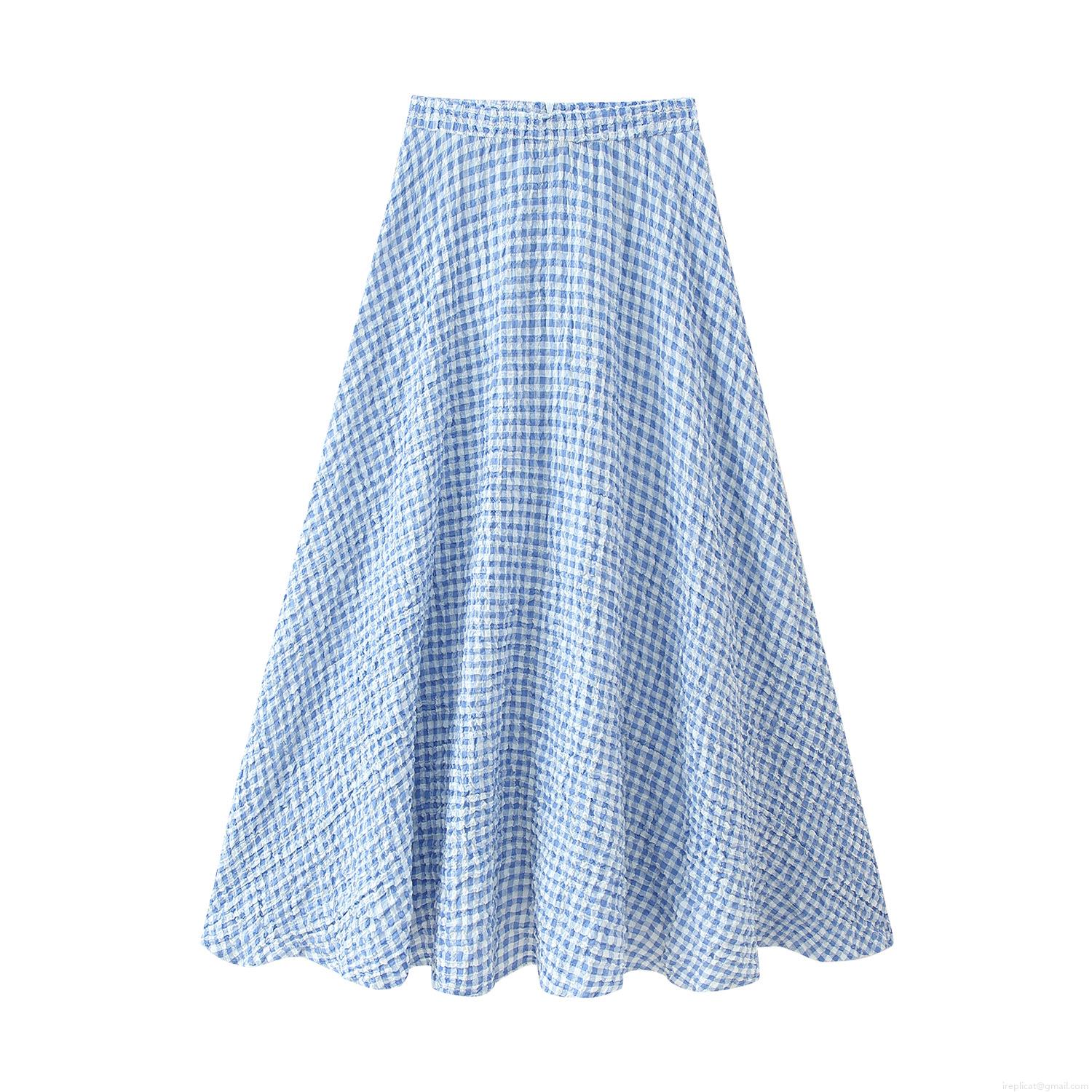 • Women's Summer 2 Piece Skirt Set Blue White Gingham V Neck Sleeveless Top With Ruffle A Line Maxi Skirt Casual Seersucker Cotton Blend Outfits