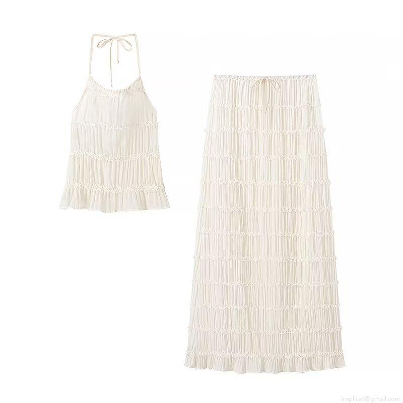 • Women's Summer 2-Piece Halter Crop Top and Ruched Midi Skirt Set Solid Color Polyester Sleeveless Ruffle Hem Streetwear Outfits for Women Vacation Clubwear