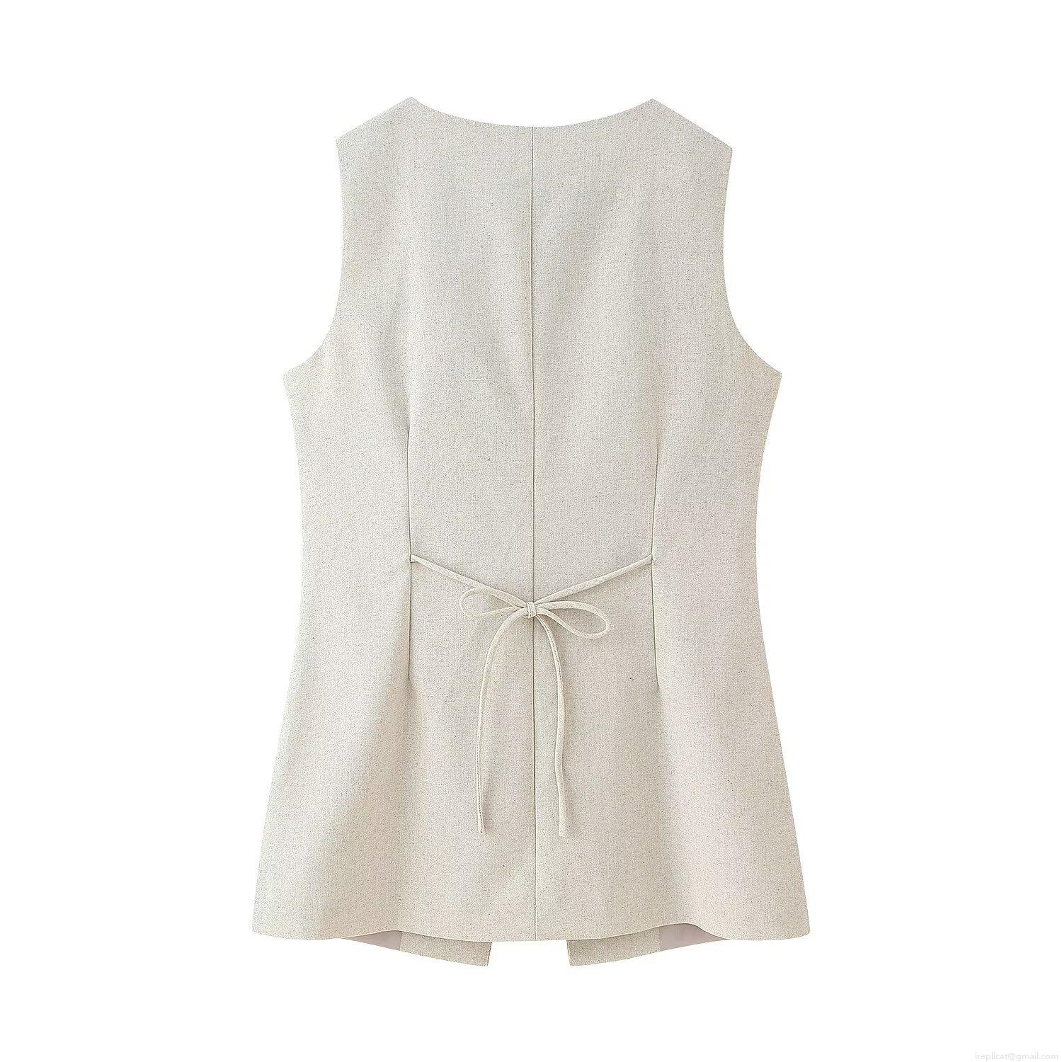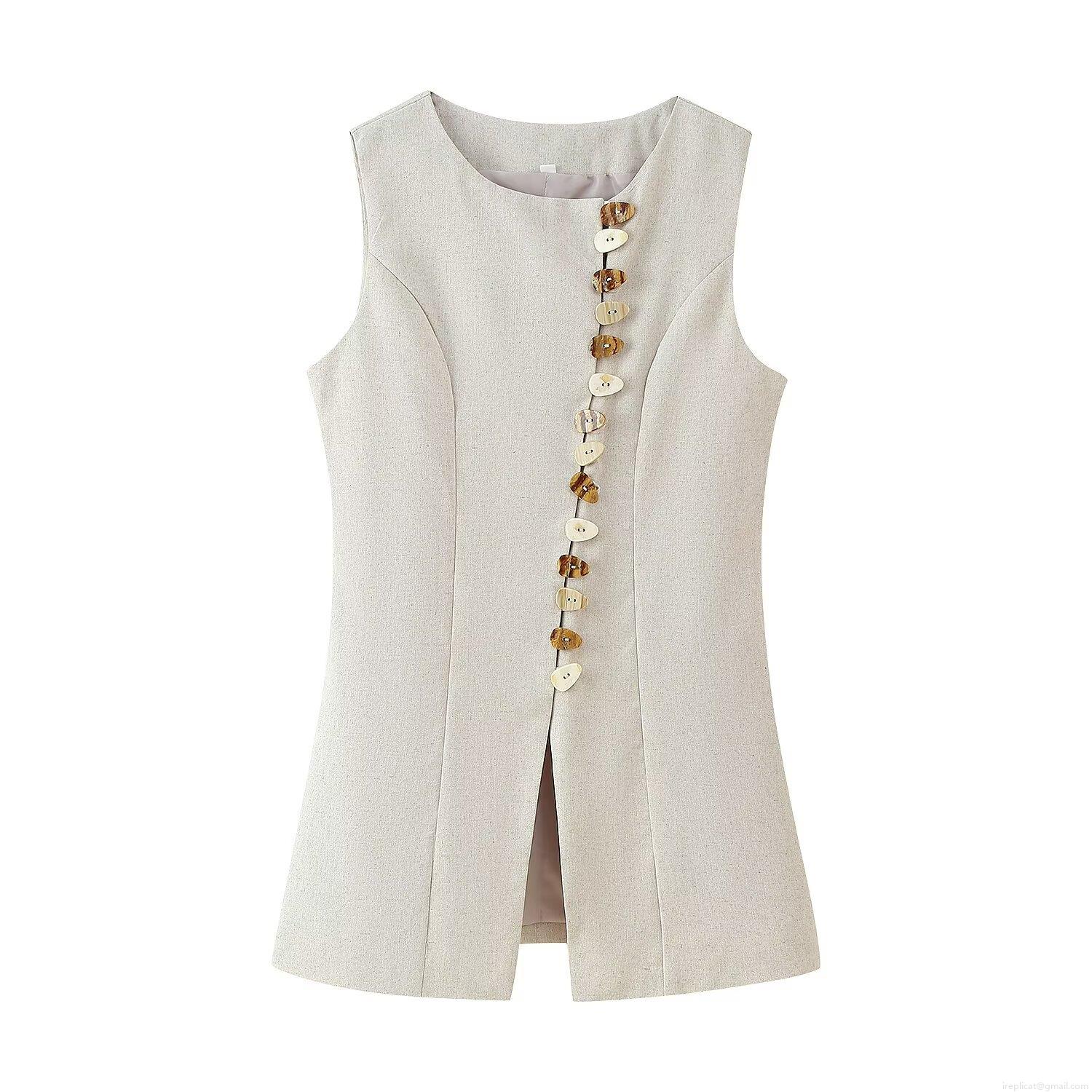 • Women's Summer European Style Round Neck Button Vest And A-Line Skirt Two Piece Set Oatmeal Casual Cotton Linen Texture Polyester Outfits For Streetwear Ladies