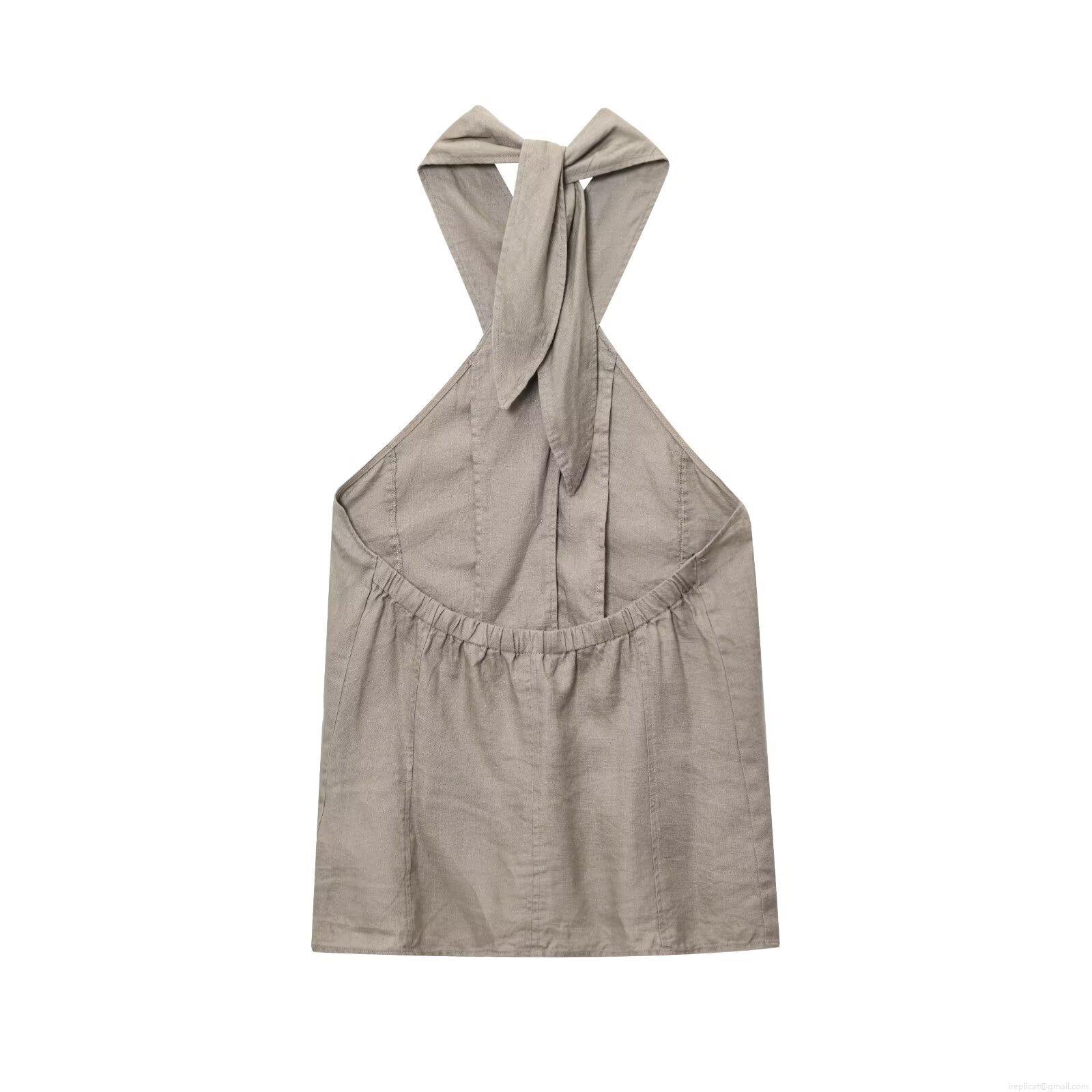 • Women's Summer Halter Neck Single Breasted Top And Midi Skirt Set Casual Linen Cotton Two Piece Outfits Taupe Solid Color Sleeveless Vest And A-Line Skirt Streetwear For Vacation