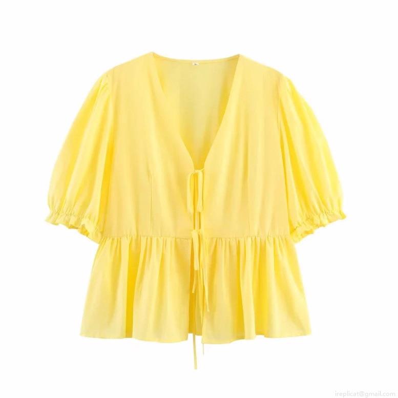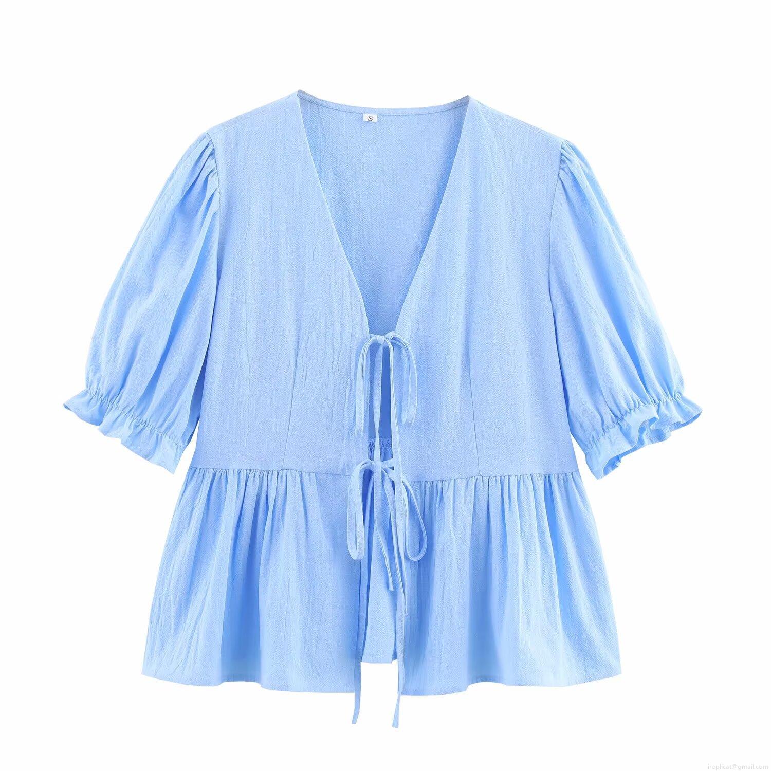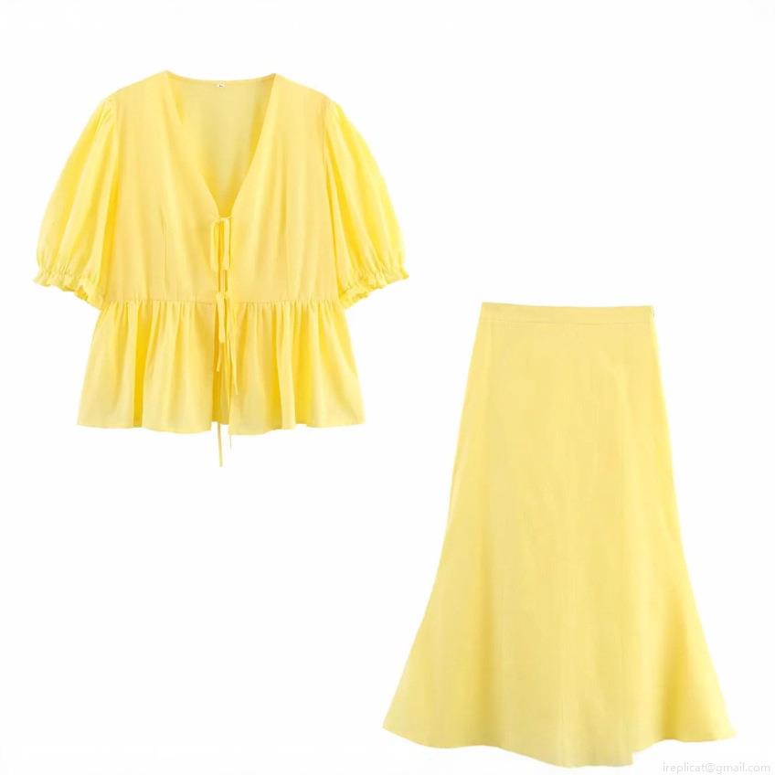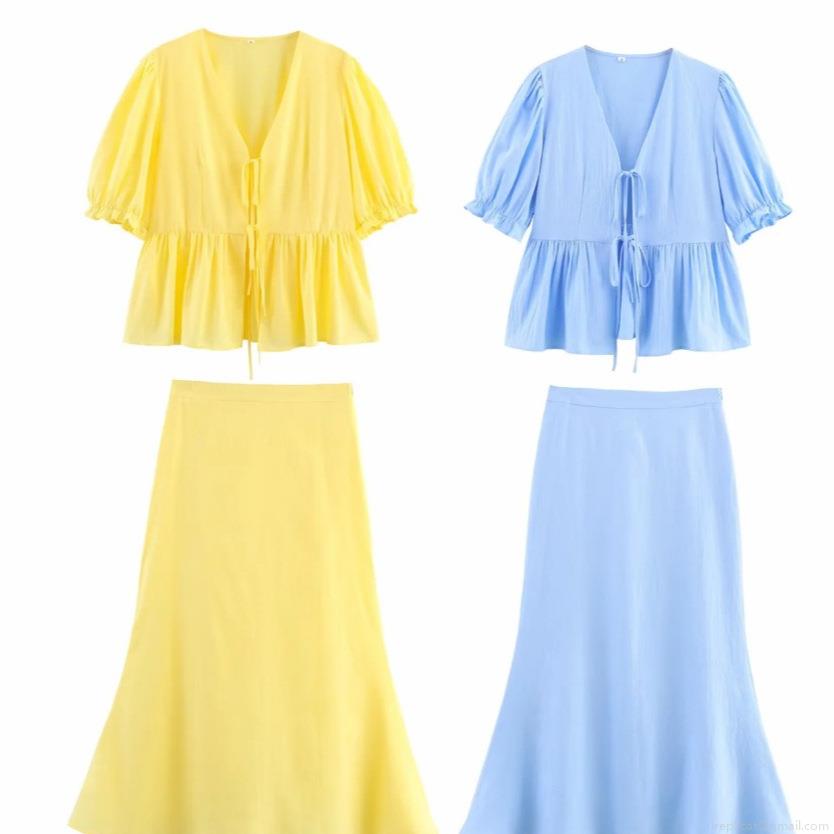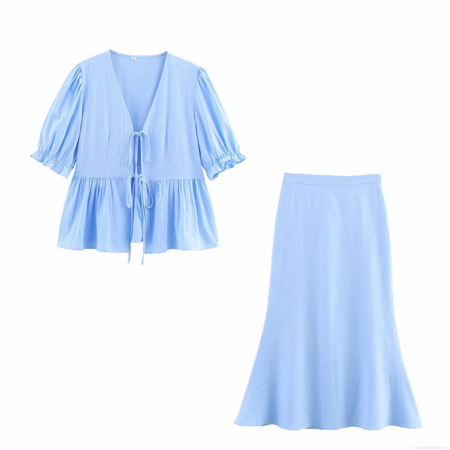 • Women's Summer Two-Piece Set V-Neck Tie-Front Puff Sleeve Ruffle Peplum Top and High Waist A-Line Midi Skirt Solid Color Casual Streetwear Skirt Suit