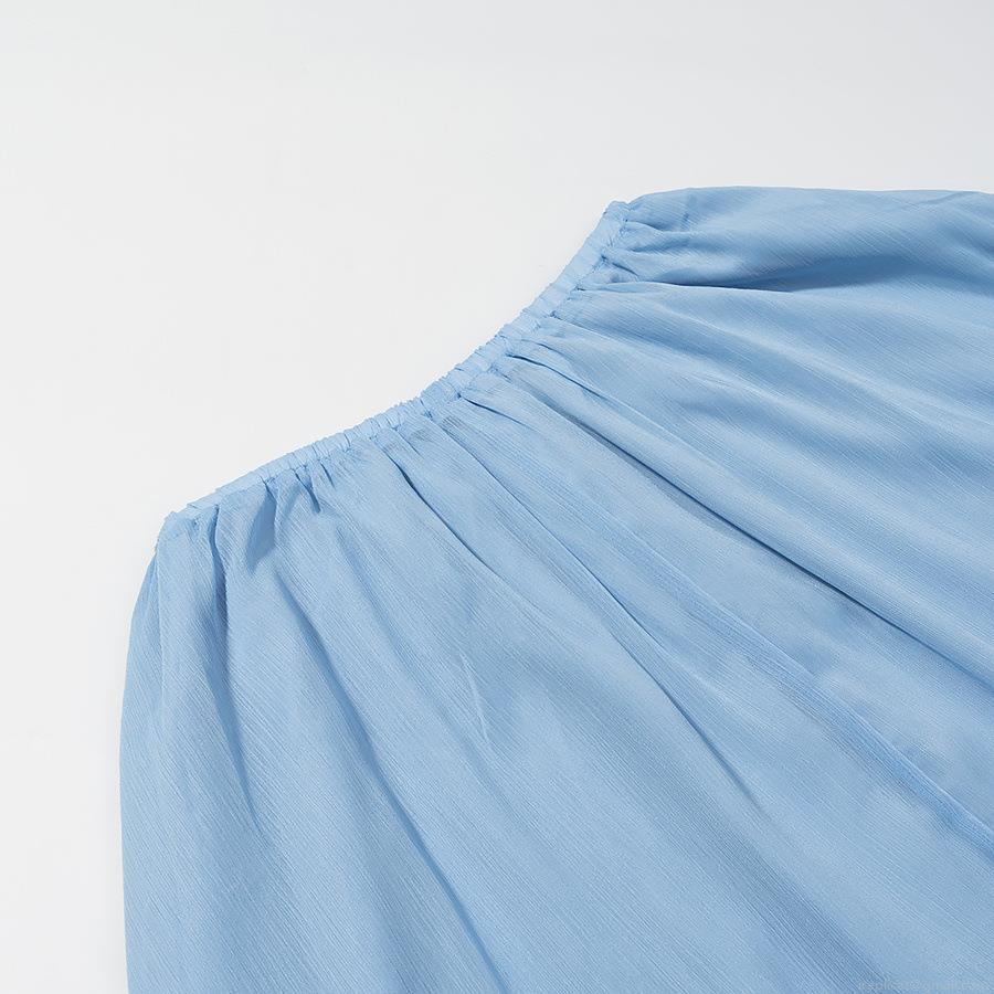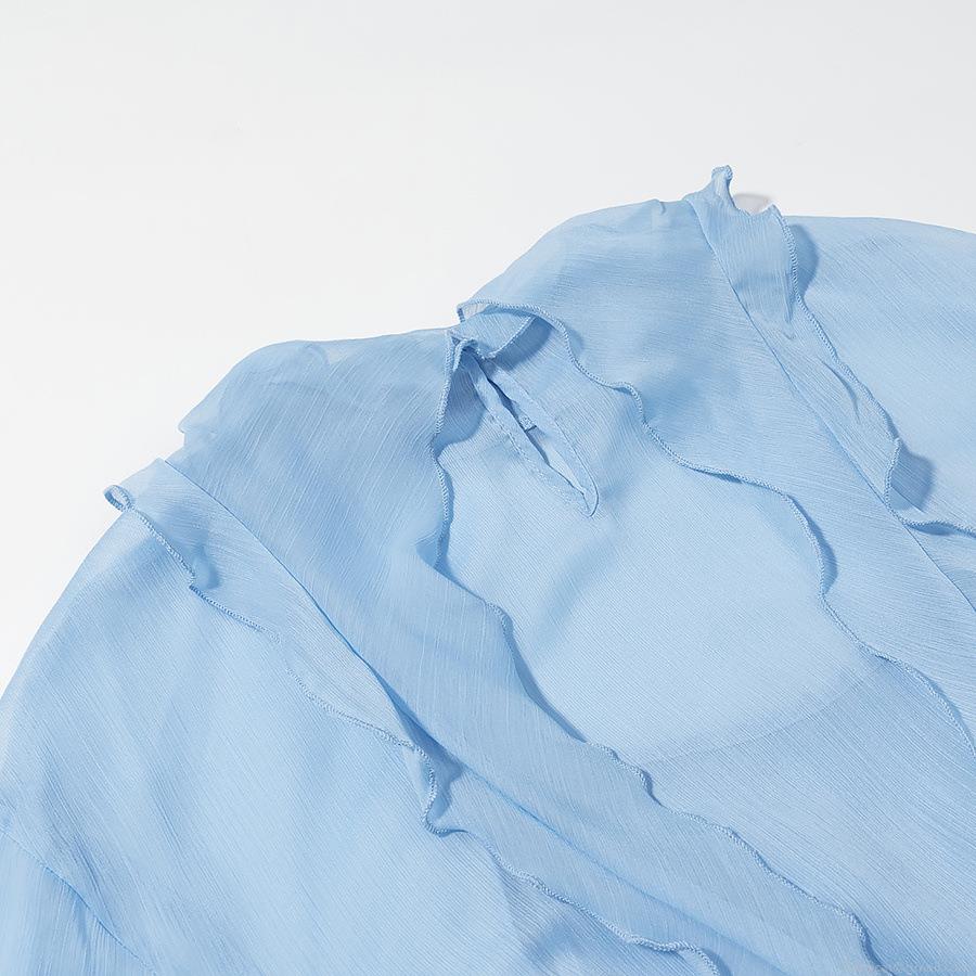 • Women's Sweet Light Blue Chiffon Two Piece Skirt Set Long Sleeve Ruffle Trim Top And Pleated Midi Skirt Casual Elegant Outfit For Lady