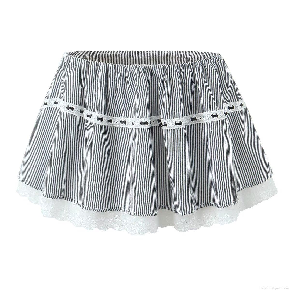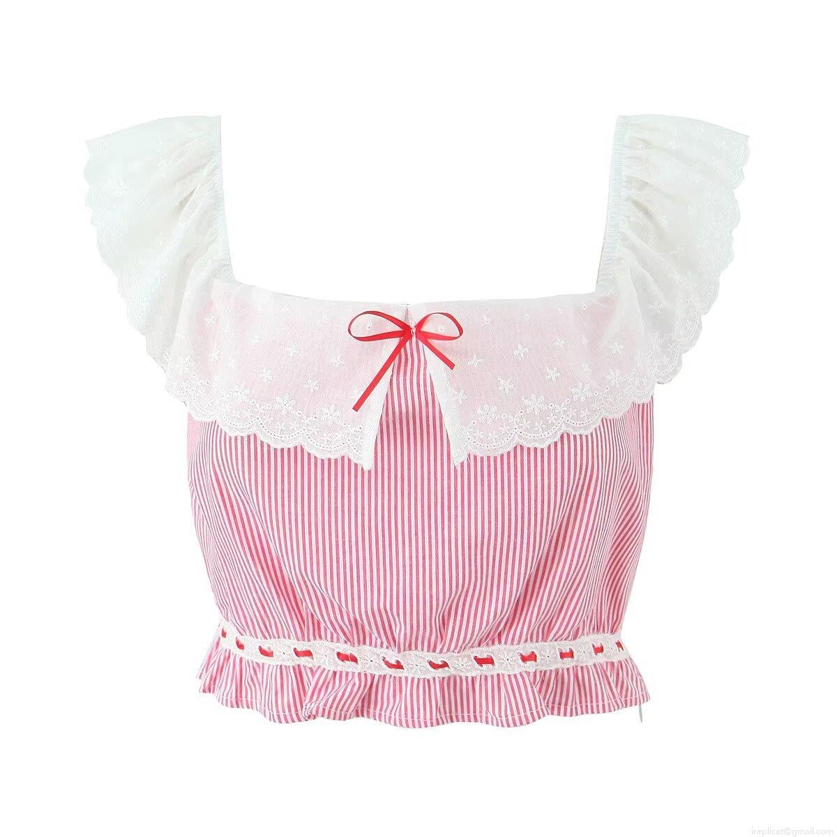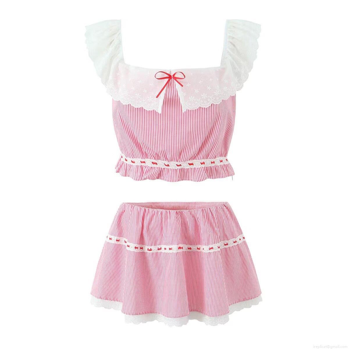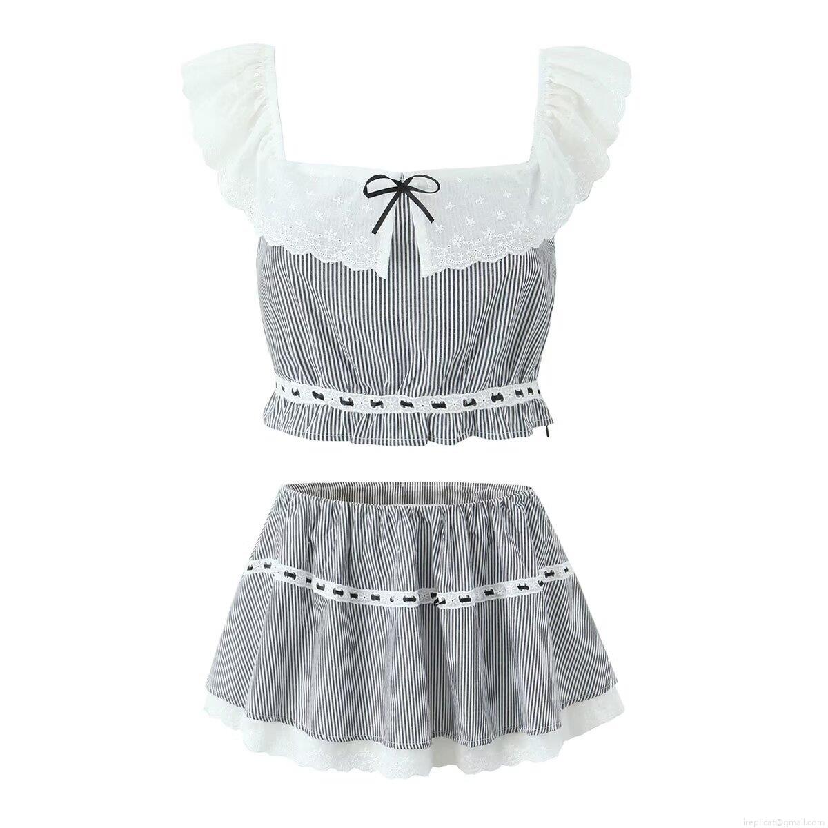 • Women's Sweet Striped Sleeveless Crop Top And Mini Skirt Set Lace Patchwork Retro Bow Two-Piece Outfit For Daily Dating Fashion Clothing