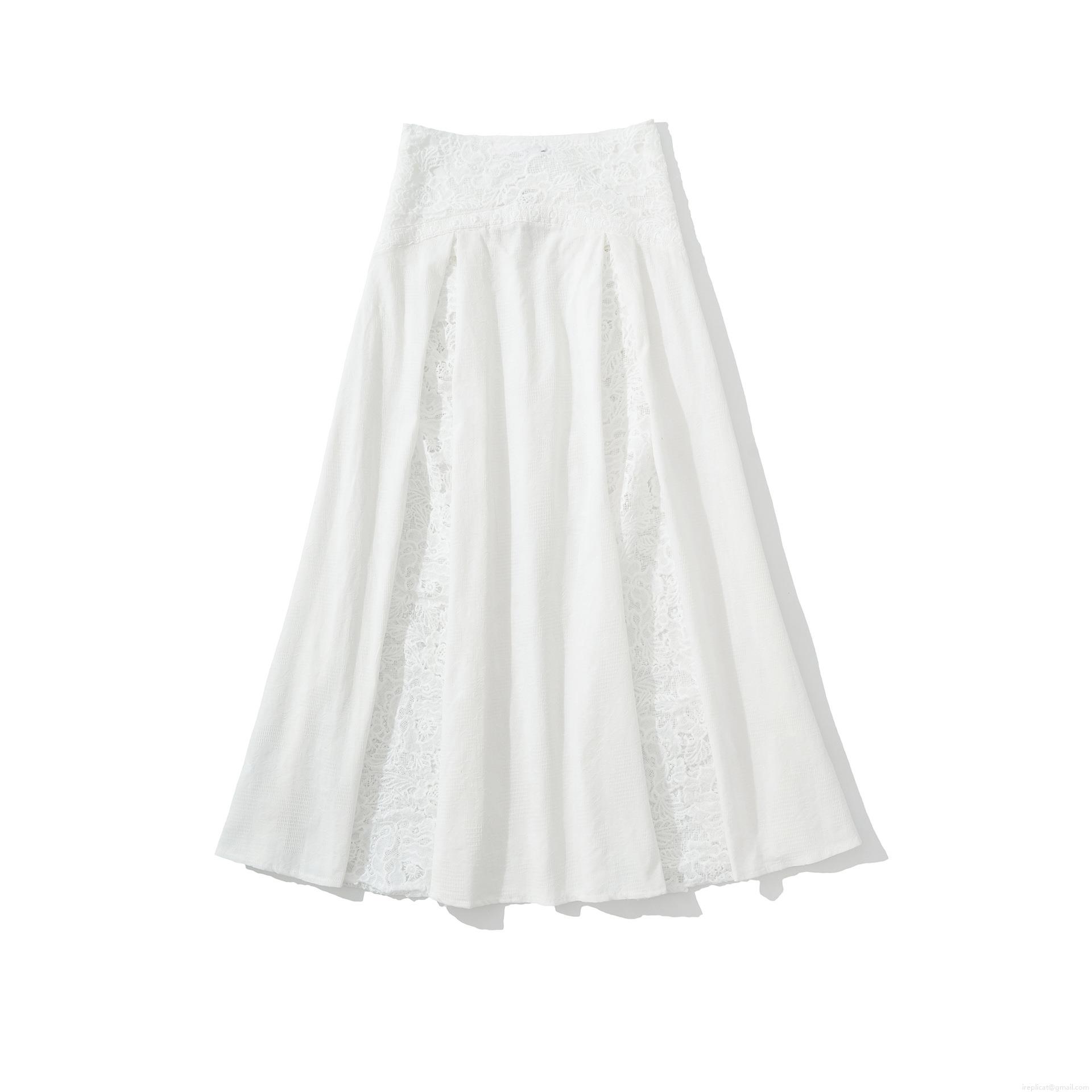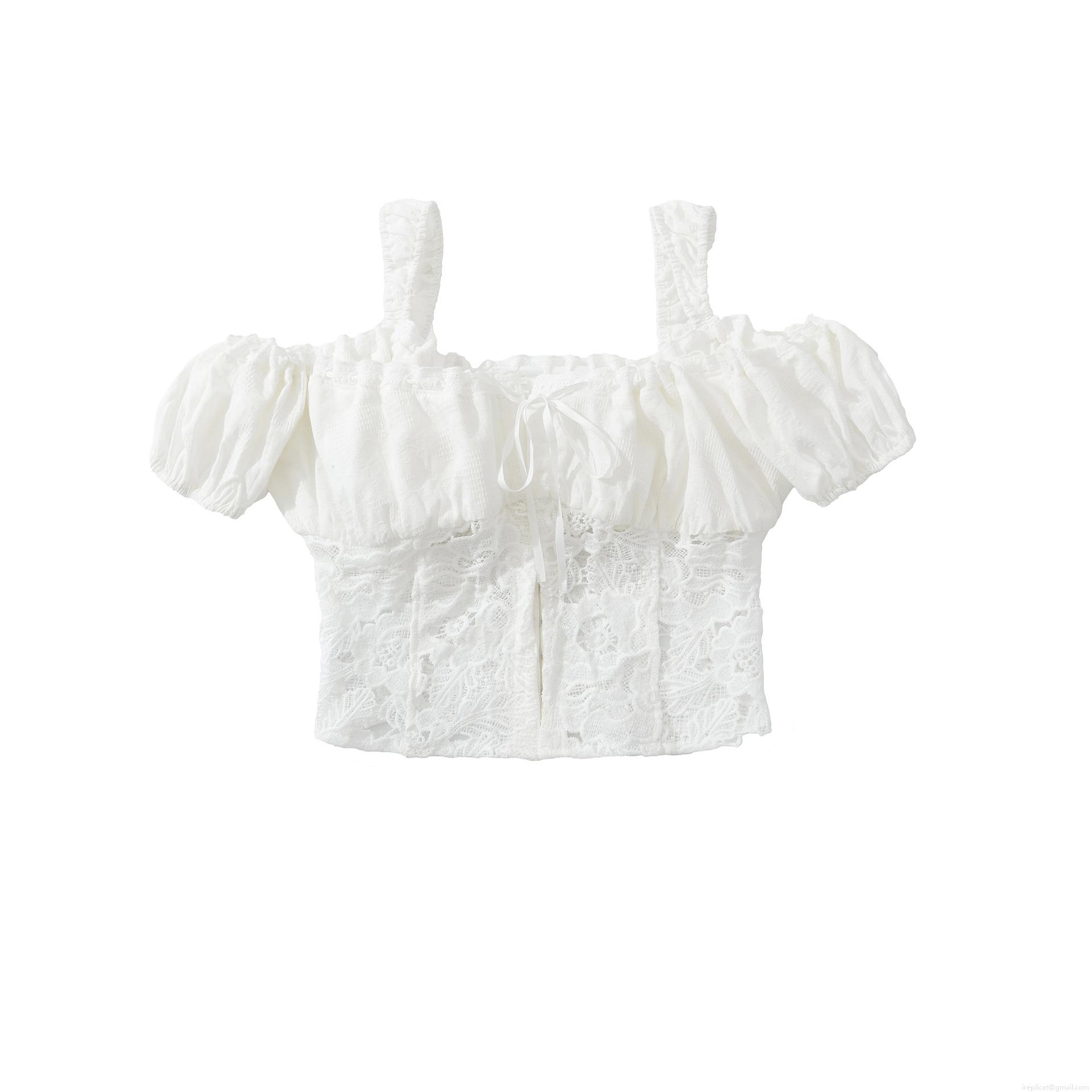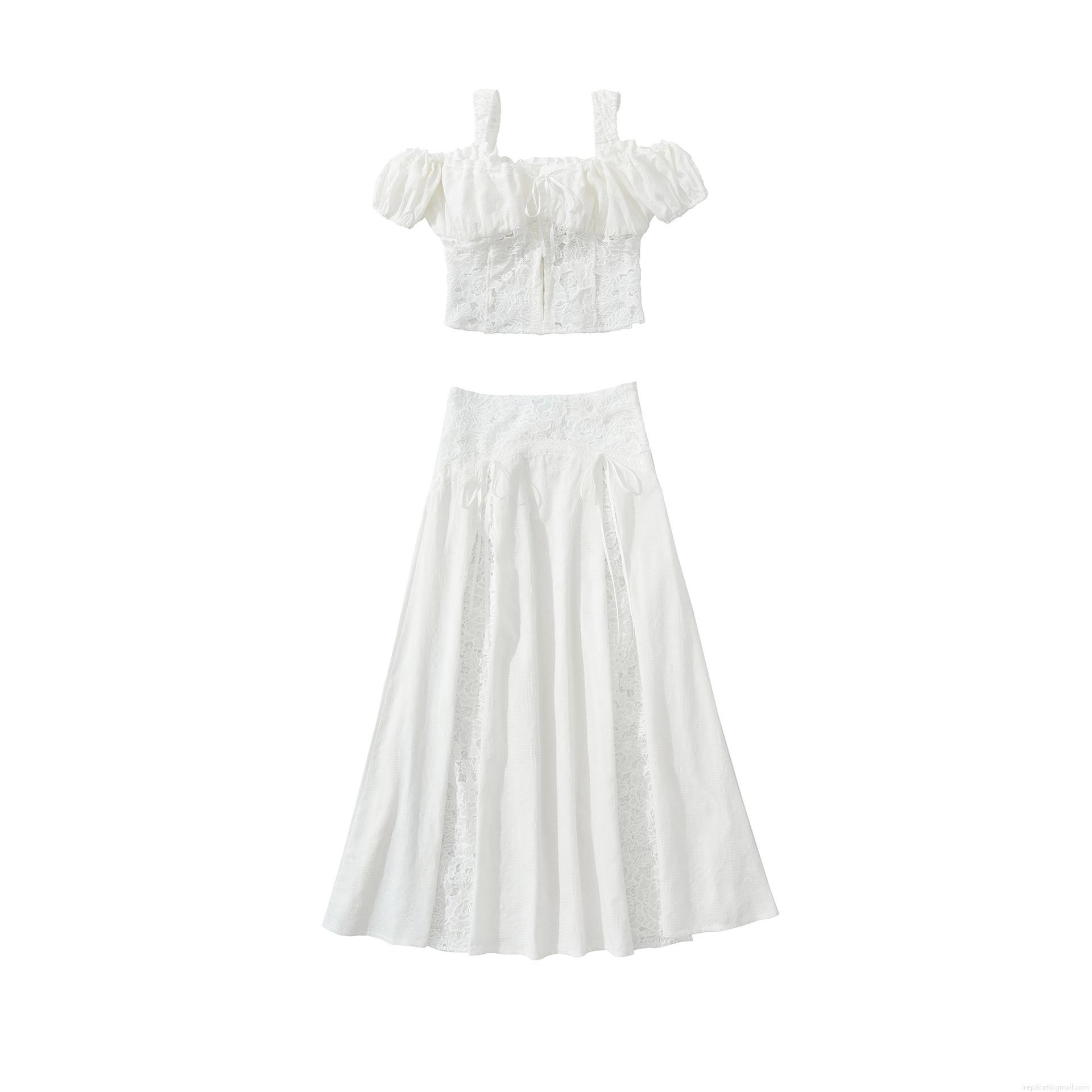 • Women's Sweet Two-Piece Set Lace Patchwork Cotton Off-Shoulder Bubble Sleeve Crop Top and Pleated Long A-Line Skirt French Style Summer Outfit White