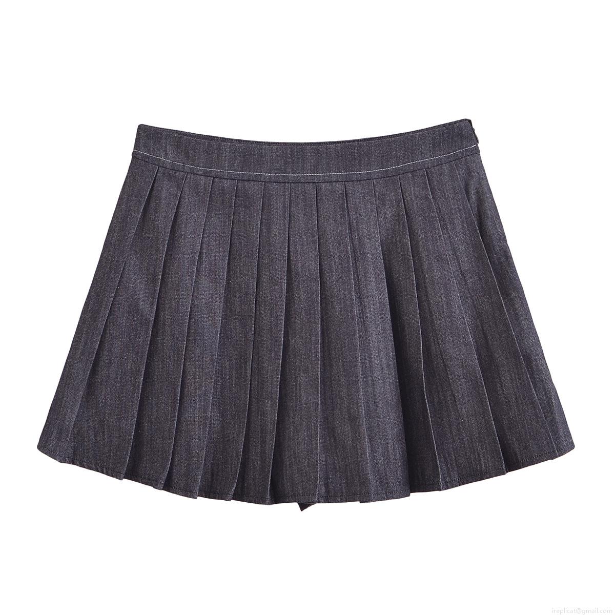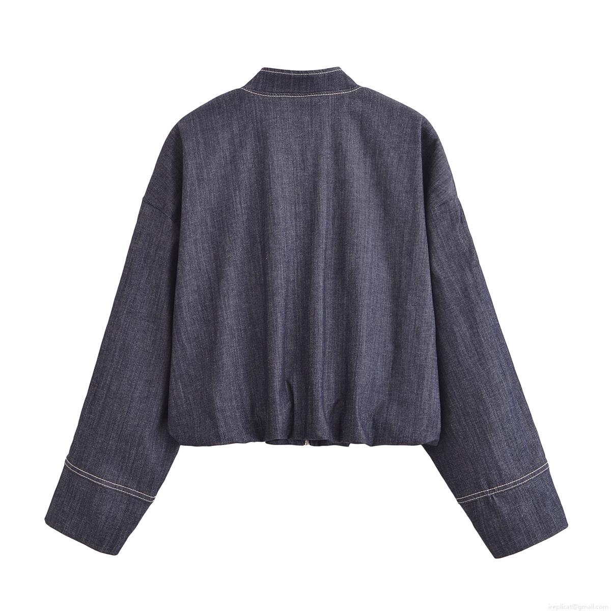 • Women's Two Piece Denim Set Casual Bomber Jacket With Metal Zip Contrast Stitch And High Waist Pleated Mini Skirt Streetwear Fashion Navy Blue Outfit For Spring Fall