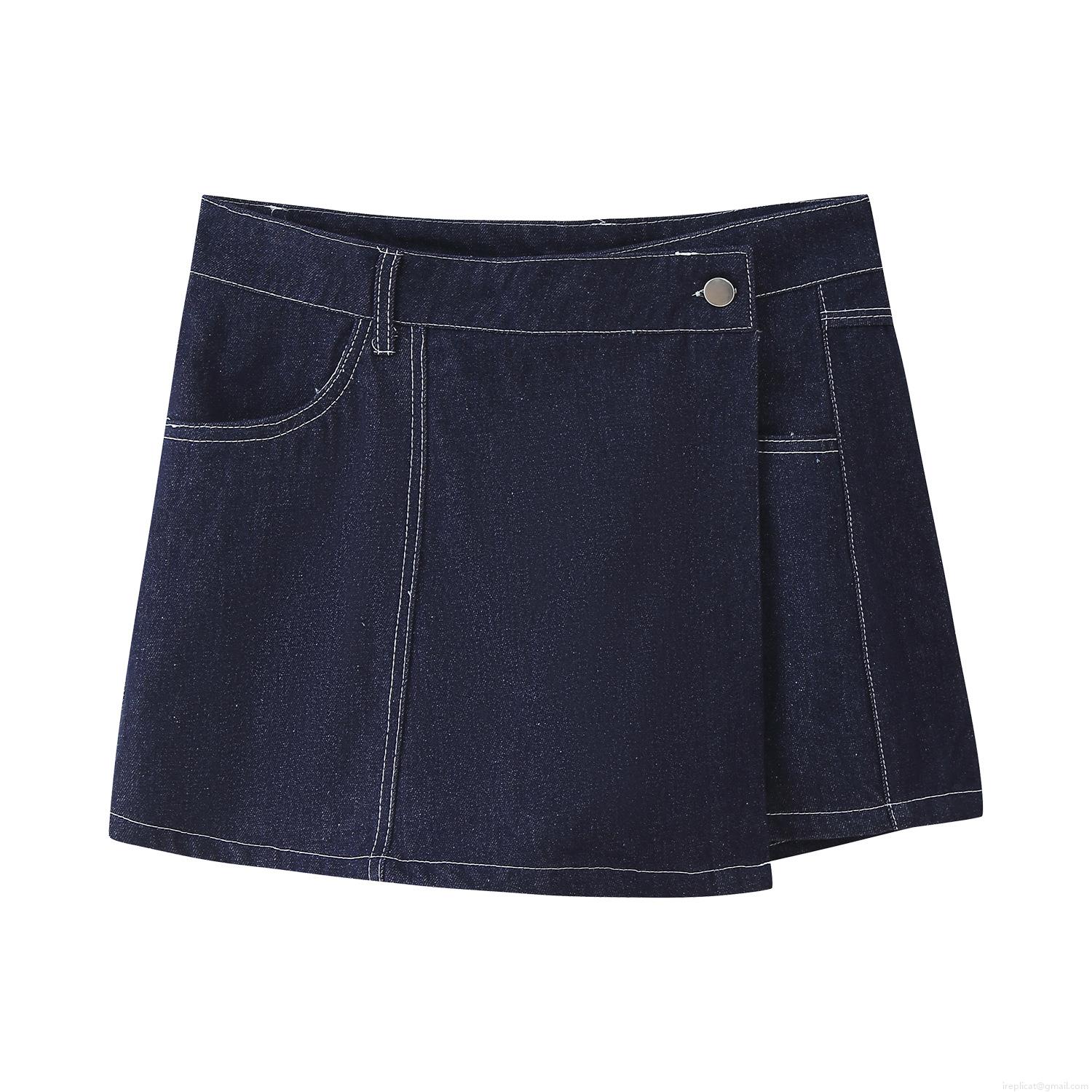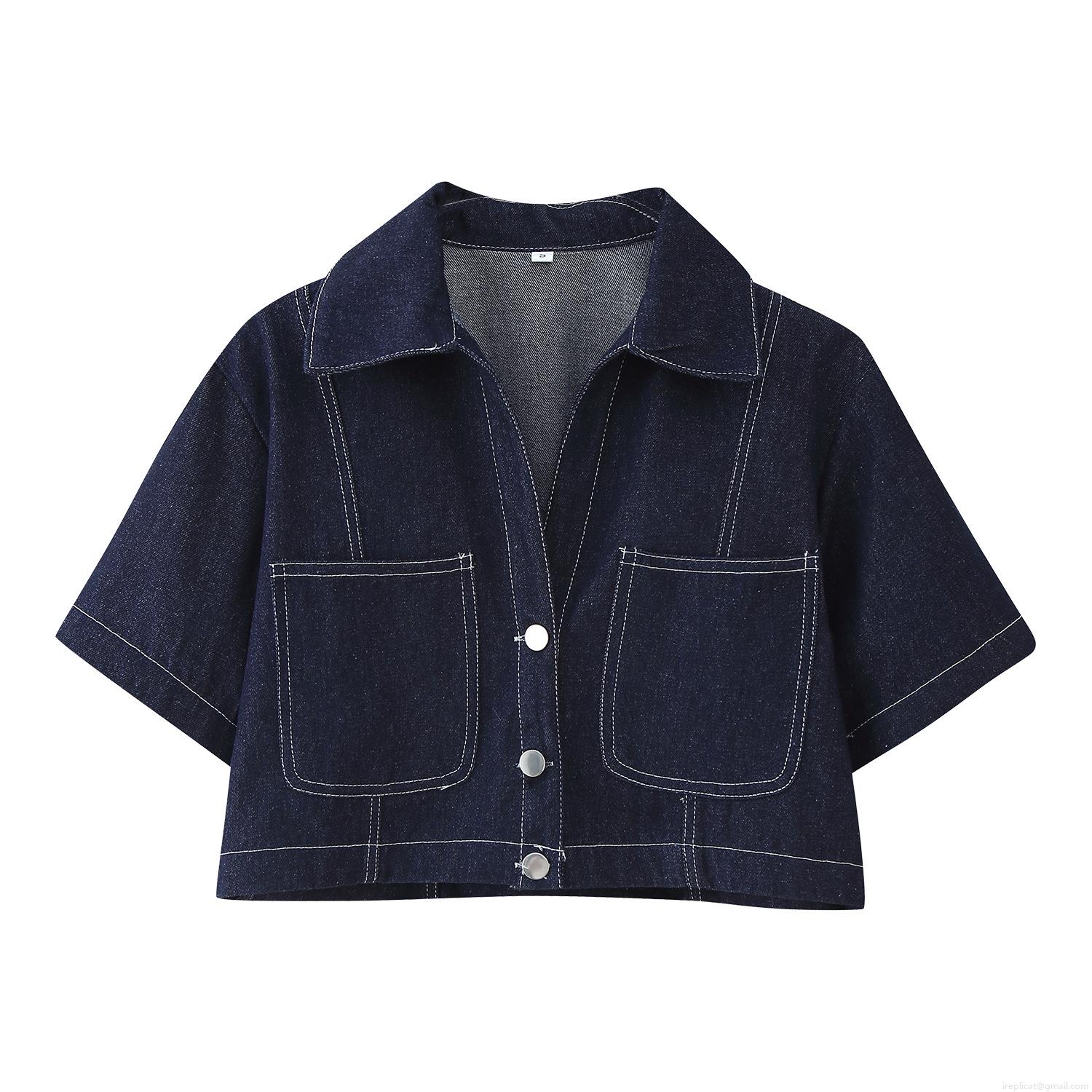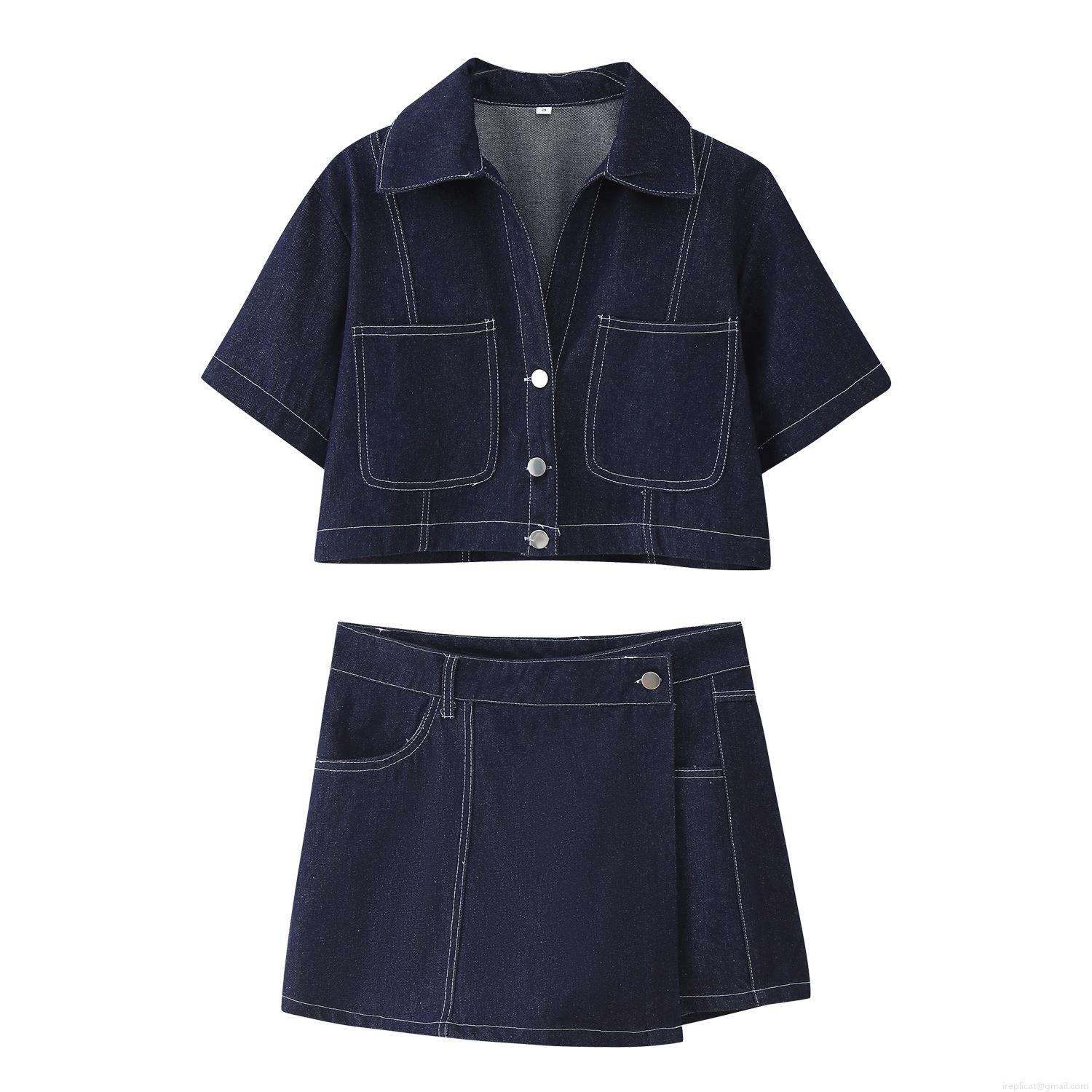 • Women's Two Piece Denim Skirt Set Contrast Stitching Short Sleeve Lapel Button Down Crop Top And High Waist Bodycon Mini Skirt Set Streetwear Outfit
