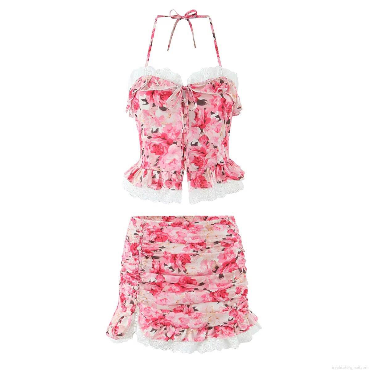 • Women's Two Piece Floral Skirt Set Sexy Halter Neck Lace Trim Camisole Top And Ruched Mini Skirt Summer Beach Outfits Sweet Pink Rose Print Suits
