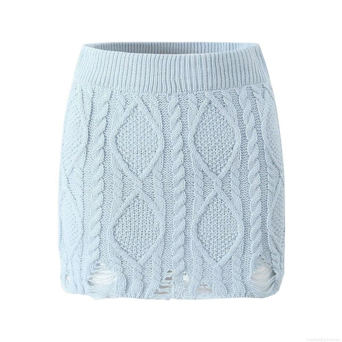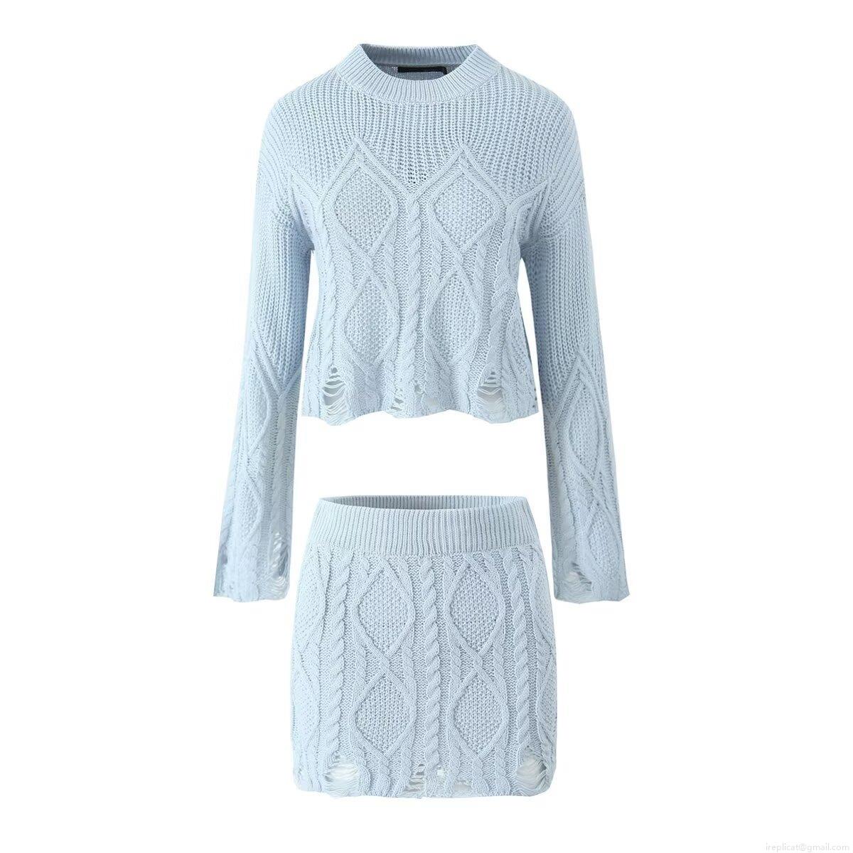 • Women's Two Piece Knit Set Distressed Cable Knit Cropped Sweater And Bodycon Mini Skirt Set Long Sleeve Round Neck Solid Color Streetwear Co-ord Suit