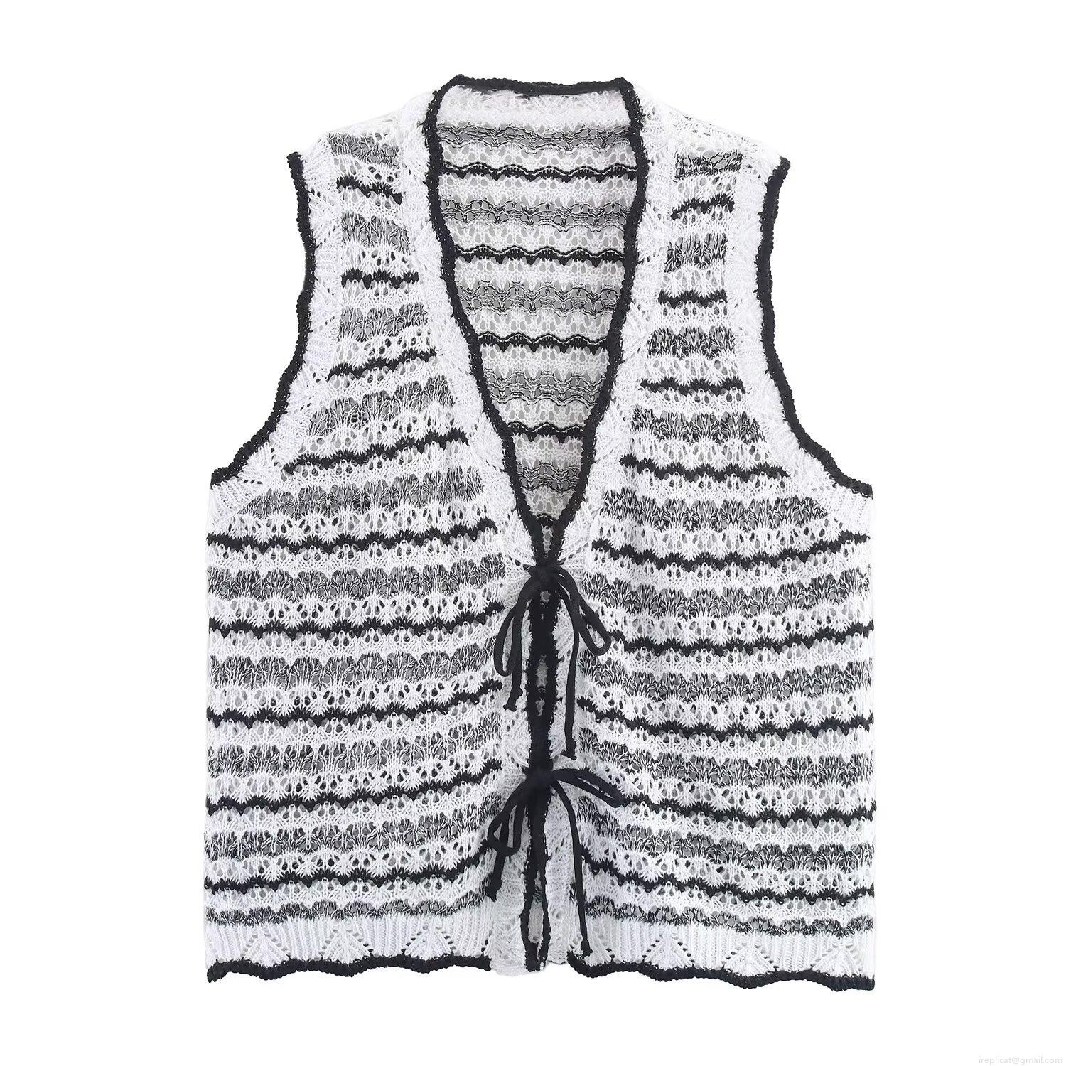 Women's Two Piece Knit Skirt Set Crochet Hollow Out Lace Up Vest Top And Striped Long Skirt Set 2025 Autumn European American Streetwear Co-ords