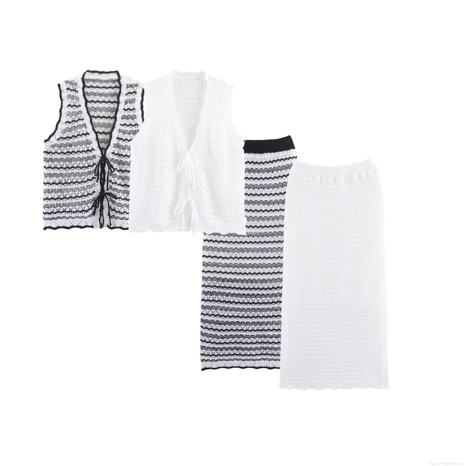 • Women's Two Piece Knit Skirt Set Crochet Hollow Out Lace Up Vest Top And Striped Long Skirt Set 2025 Autumn European American Streetwear Co-ords