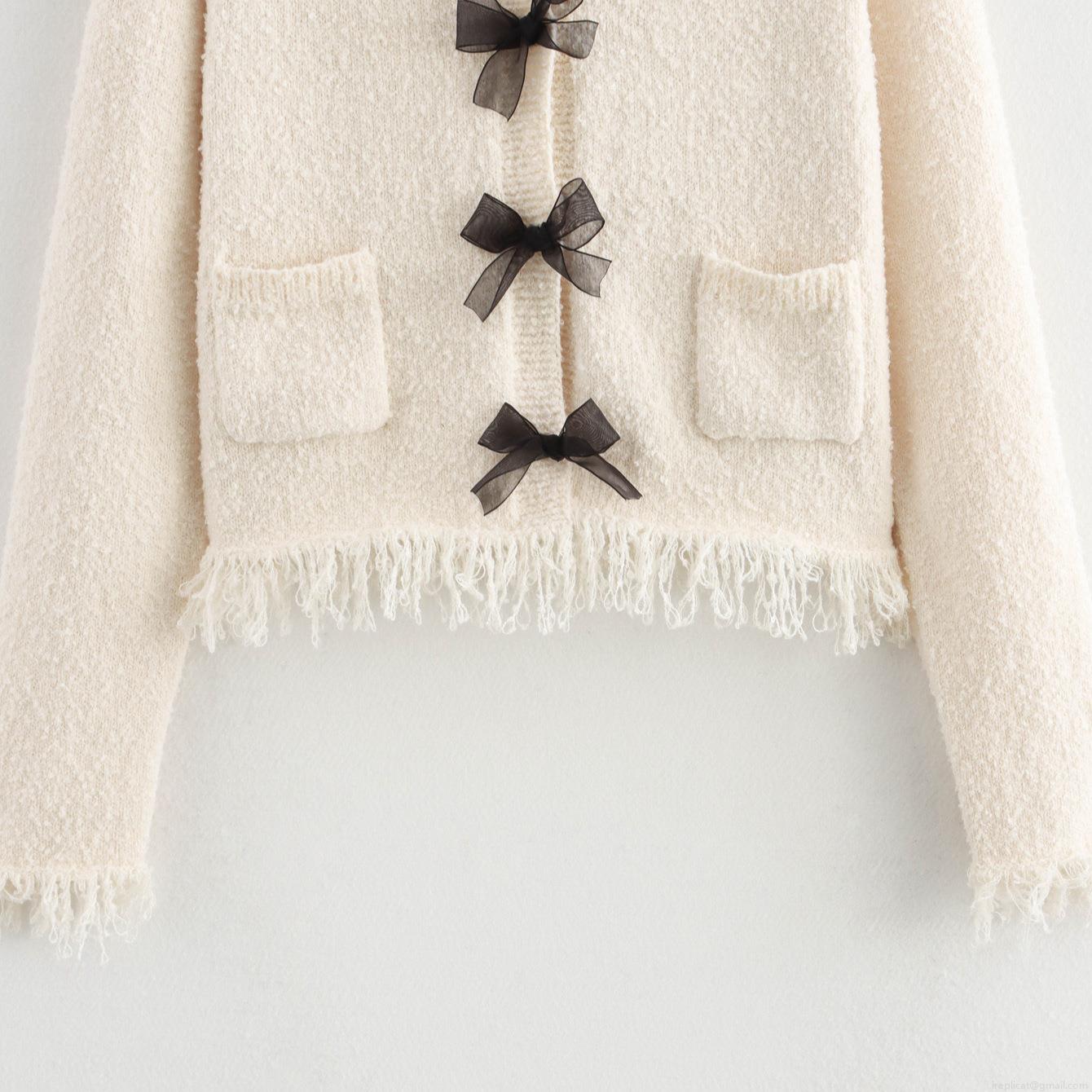 Women's Two Piece Knit Skirt Set Elegant Ivory White Cardigan Jacket With Black Mesh Bows And Fringe Trim Long Sleeve Top And Mini Skirt Sweet Lady Style Outfits