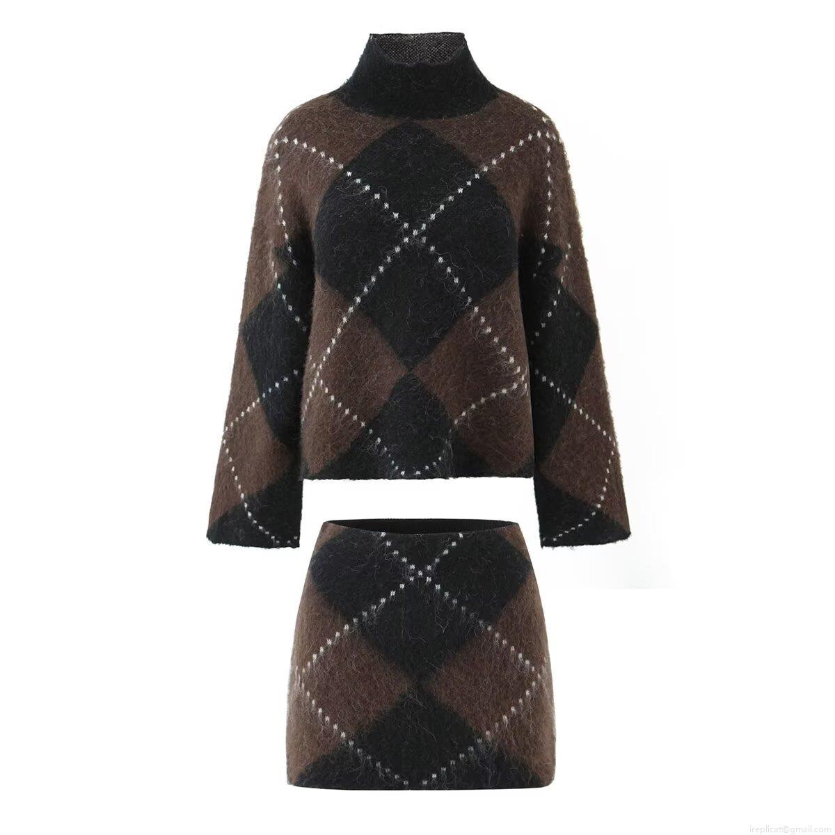 Women's Two Piece Knit Sweater Set High Neck Argyle Pattern Pullover Loose Tops And Bodycon Mini Skirt Suit Brown Black Diamond Pattern Vintage Warm Streetwear Outfits