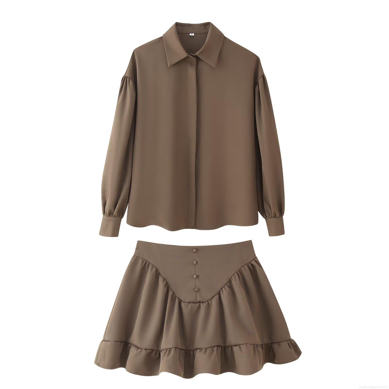 • Women's Two Piece Skirt Set Long Sleeve Lapel Shirt and Ruffle Mini Skirt Outfits Solid Color Streetwear Casual Matching Sets For Ladies