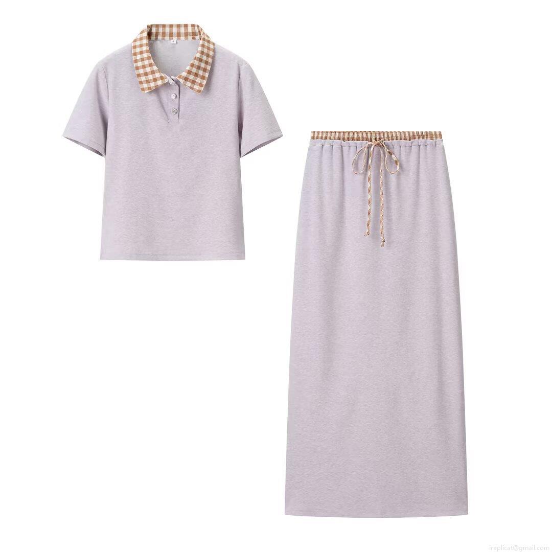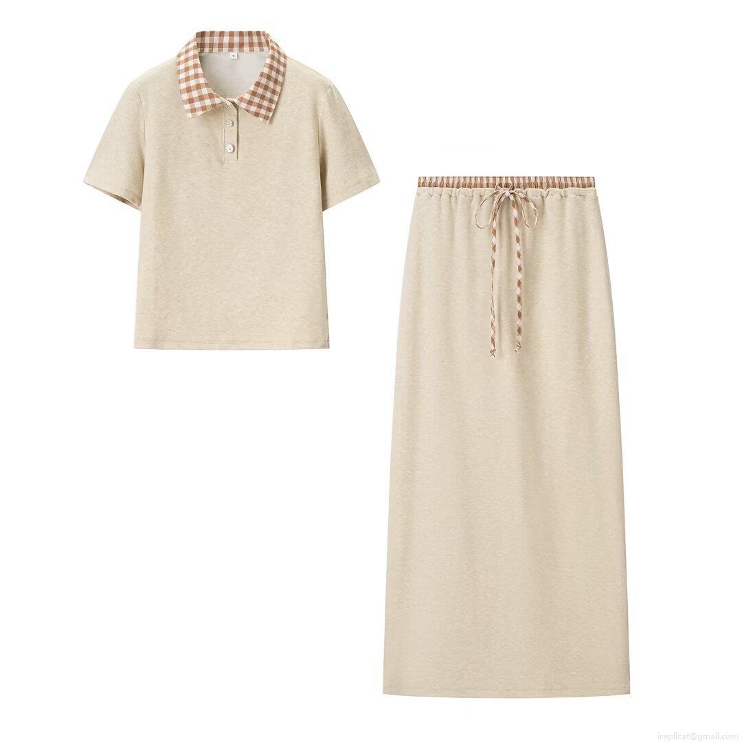 • Women's Two Piece Skirt Set Plaid Stitching Polo Collar Short Sleeve Top And Long Straight Skirt Casual Knitted Streetwear Outfit For Ladies