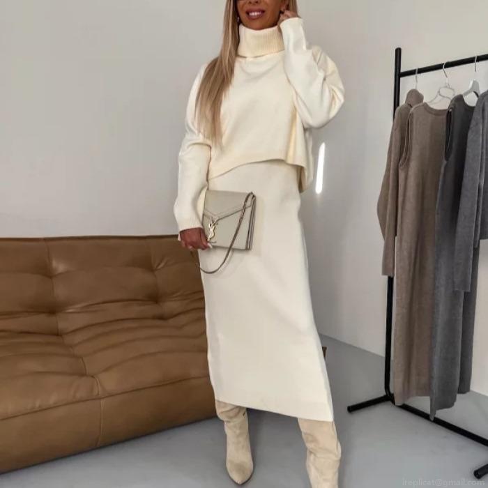 • Women's Two-Piece Knit Set Solid Color High Collar Turtleneck Sweater And Sleeveless Long Dress Slim Fit Knitted Outfits For Autumn Winter