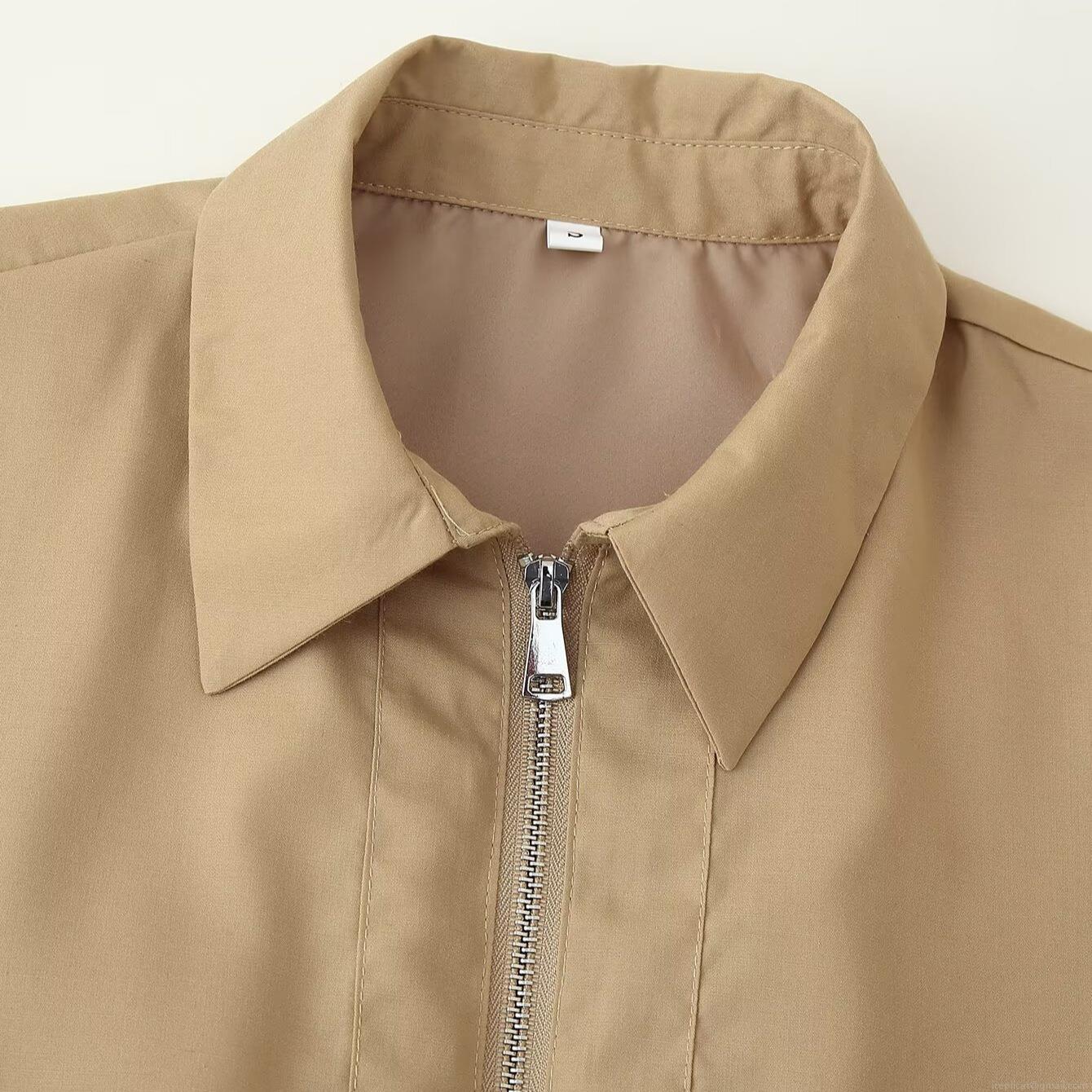 Solid Color, Pleats, Lapel, Metal Zipper, Wide Sleeves