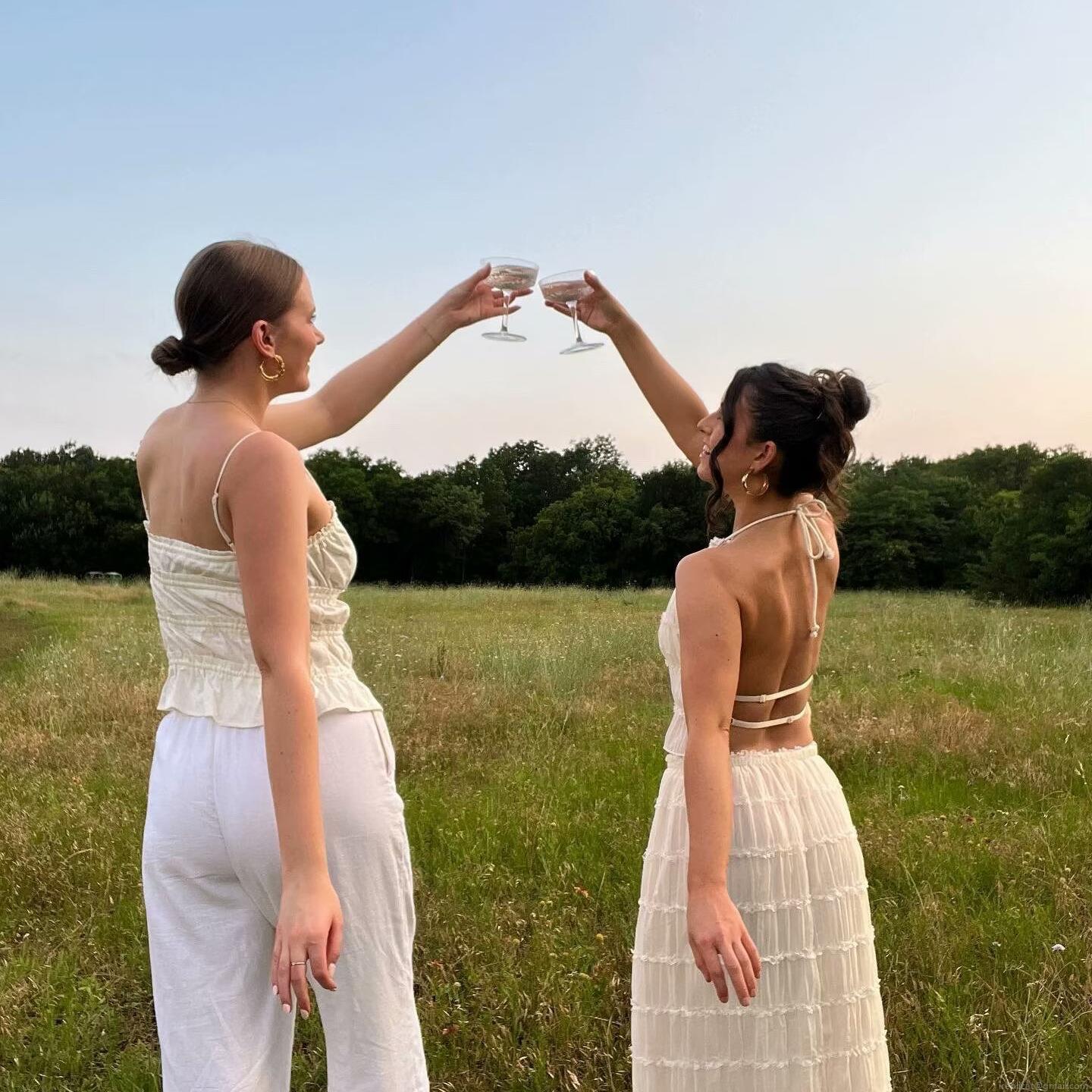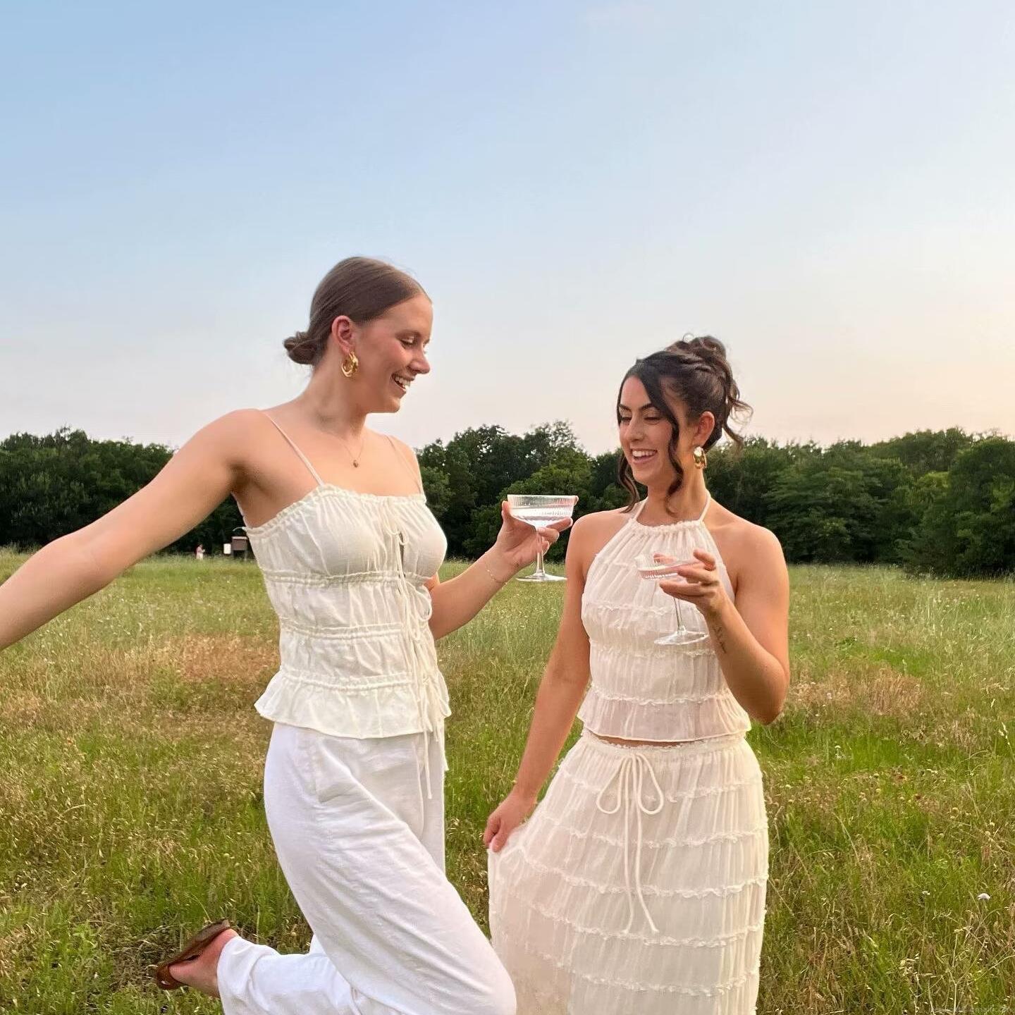 • Women's Vacation Two Piece Skirt Set Halter Neck Tie Up Crop Top And High Waist Pleated Ruffle Maxi Skirt Plain Smocked Summer Beach Party Outfit
