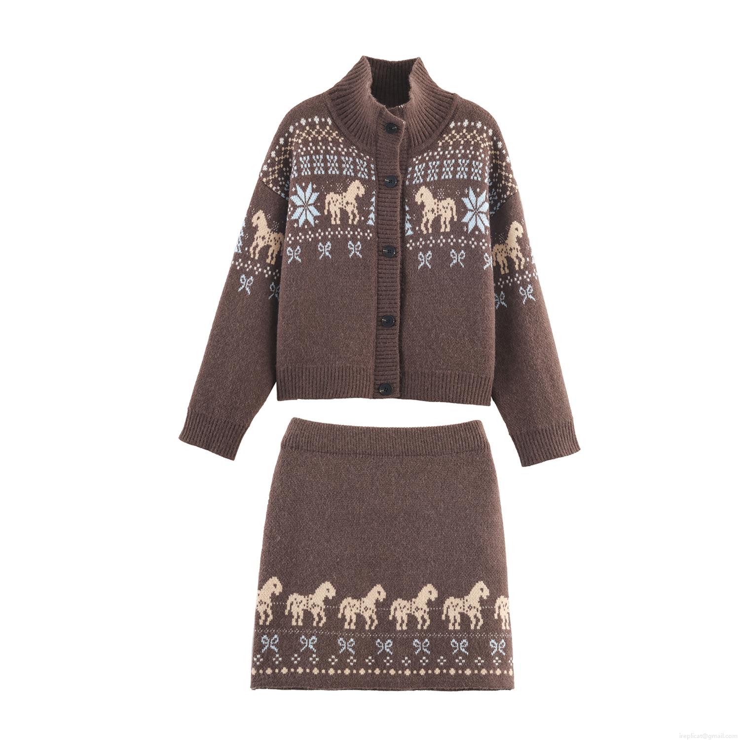 • Women's Vintage Jacquard Knit Set Mock Neck Button Down Cardigan And Mini Skirt Two Piece Suit Horse Snowflake Long Sleeve Outfit For Casual Daily Streetwear