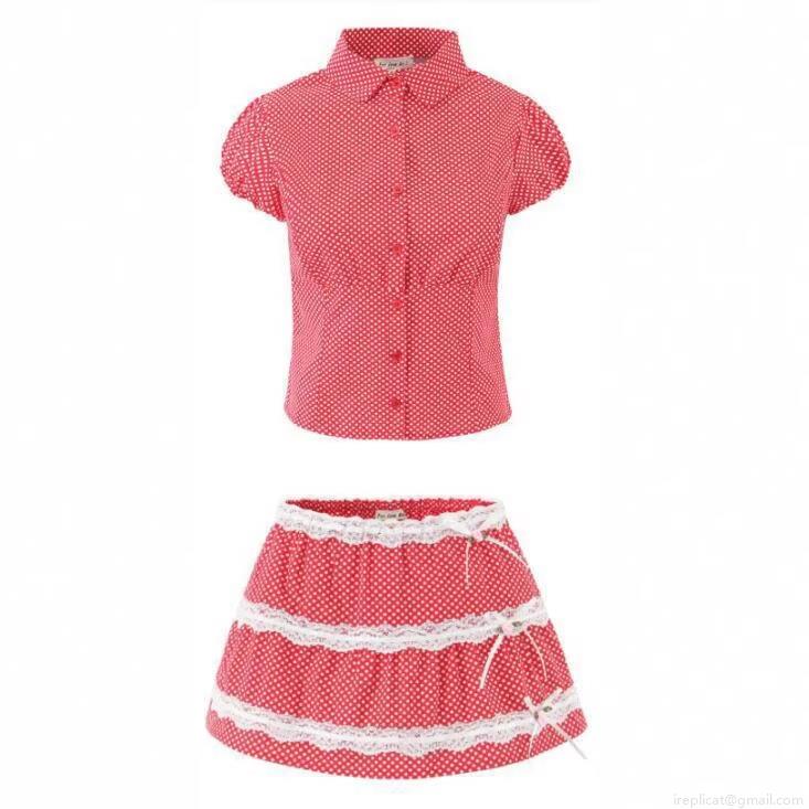 • Women's Vintage Polka Dot Two Piece Skirt Set Puff Sleeve Button Down Shirt And Layered Lace Trim Mini Skirt Casual Fashionable Summer Outfit