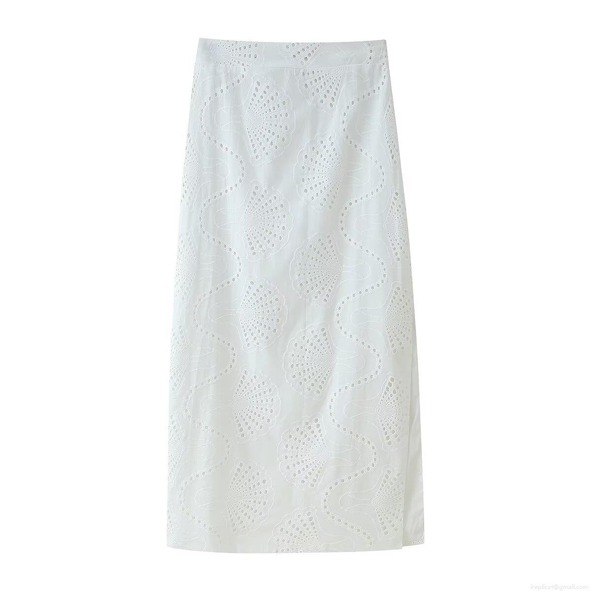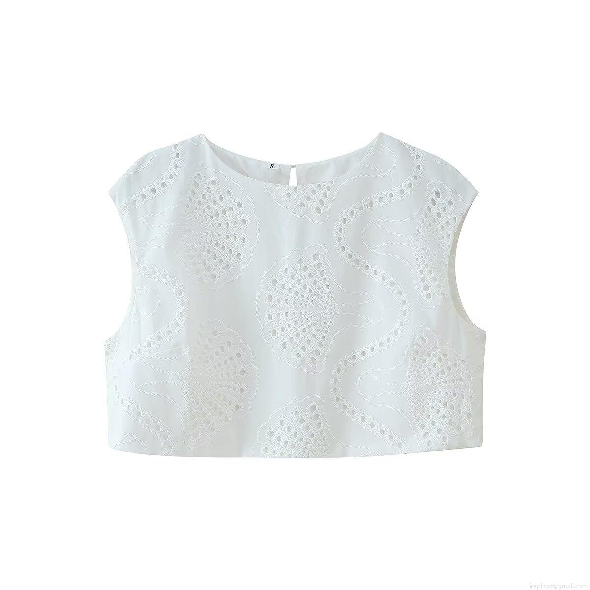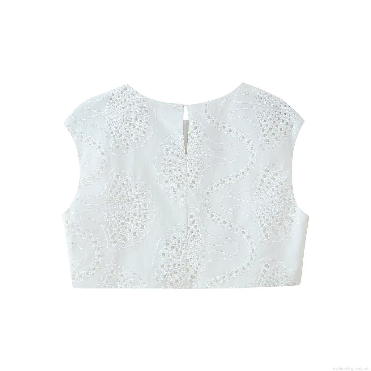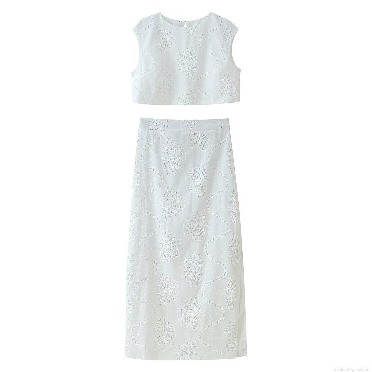 • Women's White Eyelet Embroidery Two Piece Skirt Set Sleeveless Cropped Round Neck Top And High Waist Midi Skirt Summer Street Style Outfit