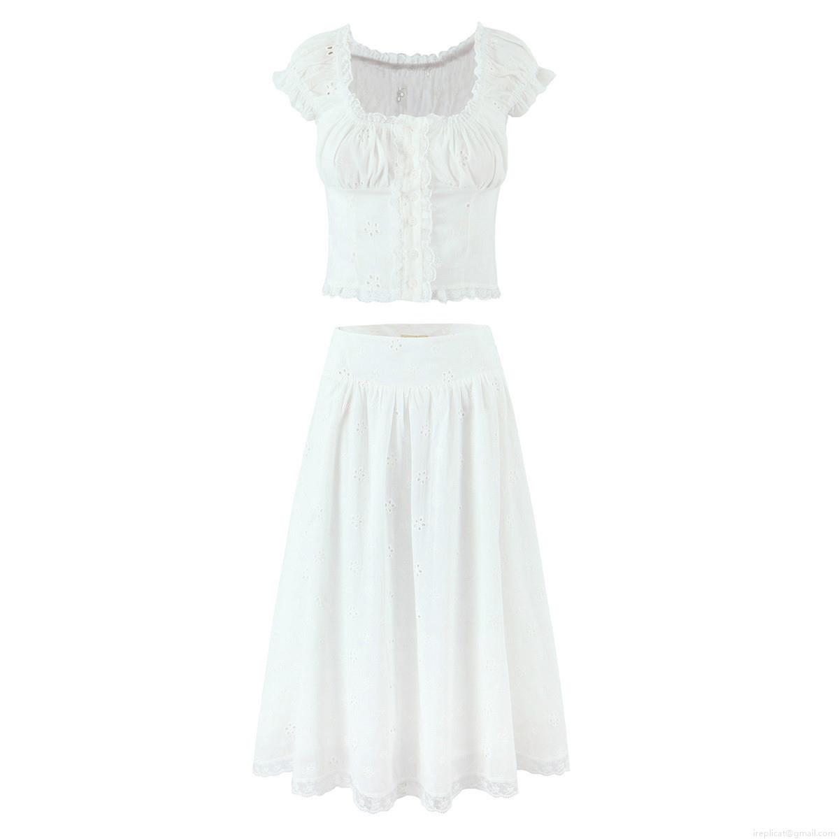 • Women's White Eyelet Embroidery Two Piece Skirt Set Sweet Hollow Out Lace Puff Sleeve Crop Top and Midi Skirt for Summer Beach Vacation Dating Casual