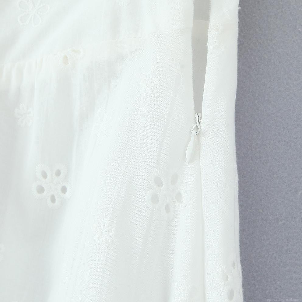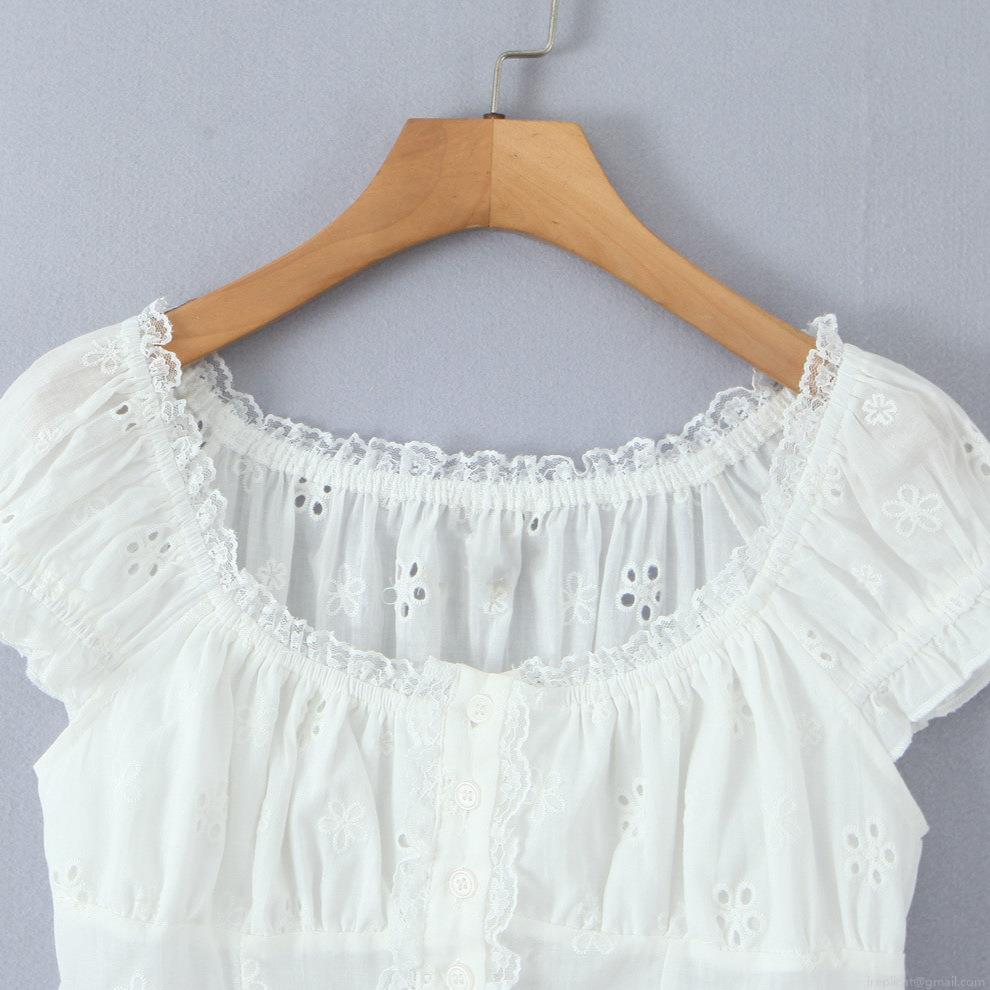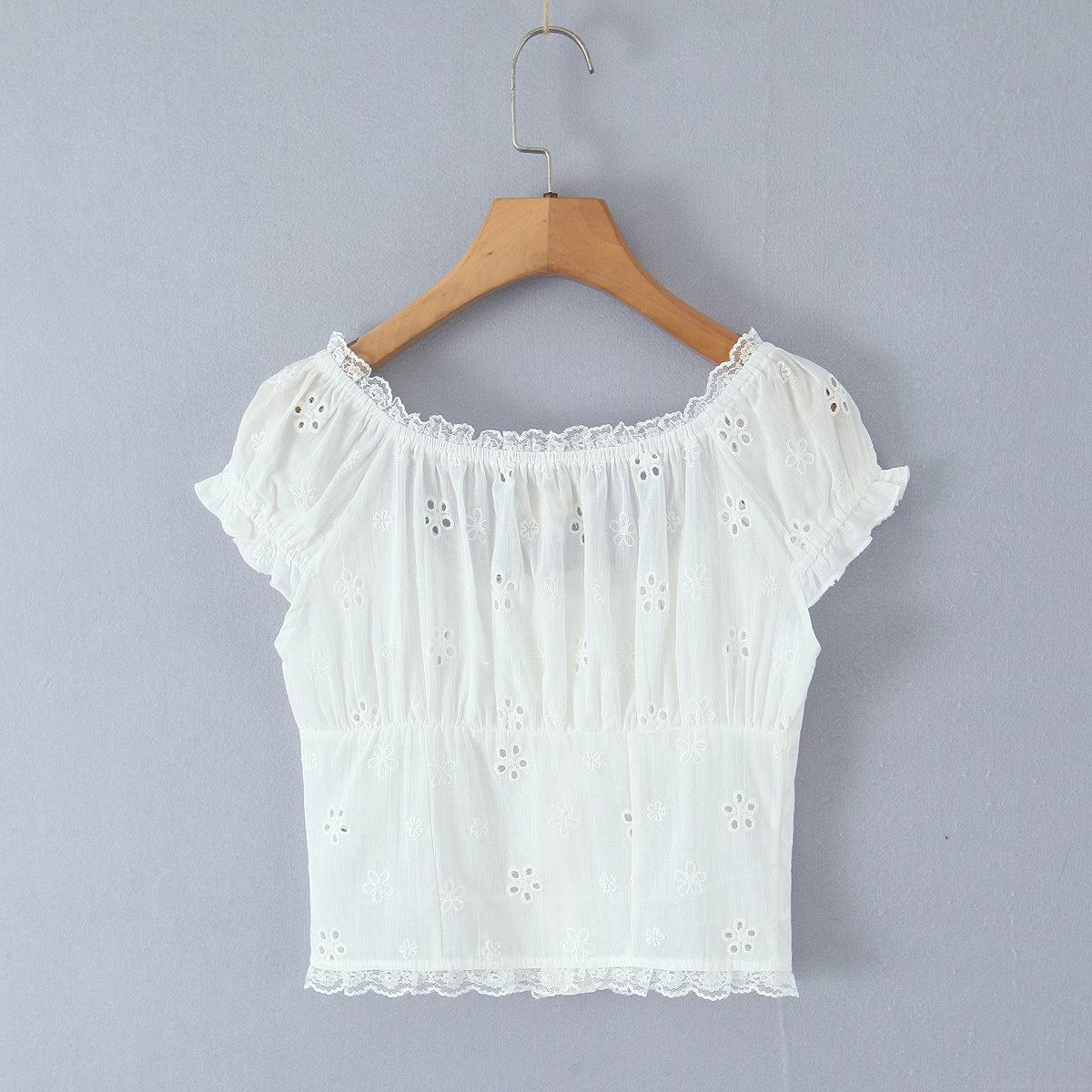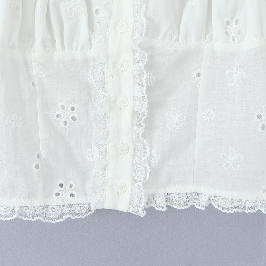 Embroidery, Hollow Out, Flowers, Button, Puff Sleeves, Lace, Hollowed-out Eye Holes