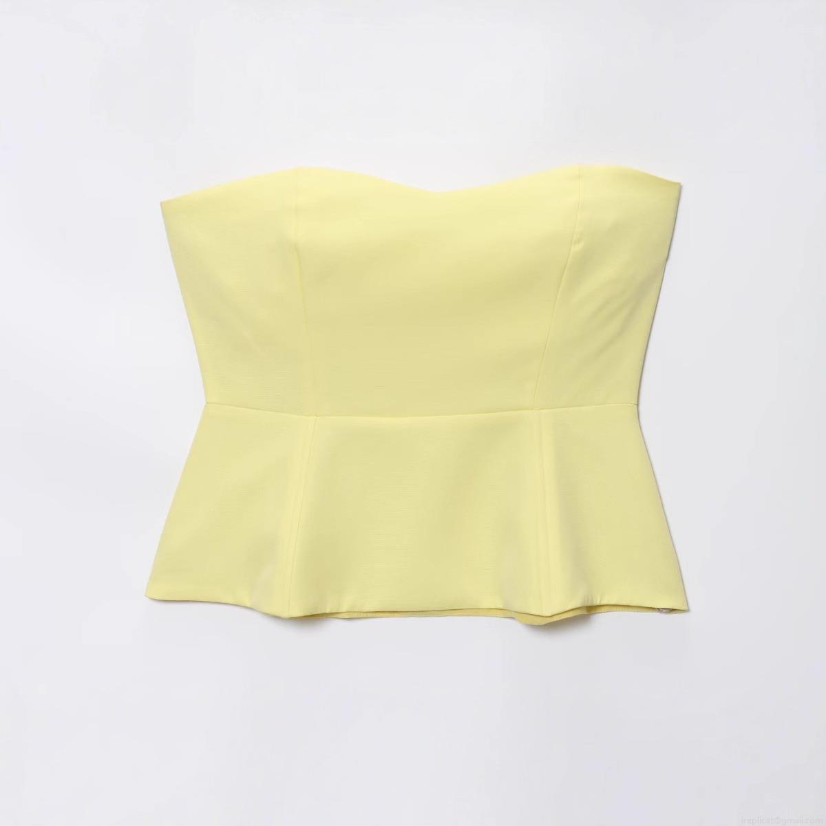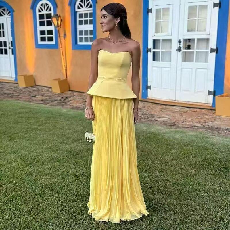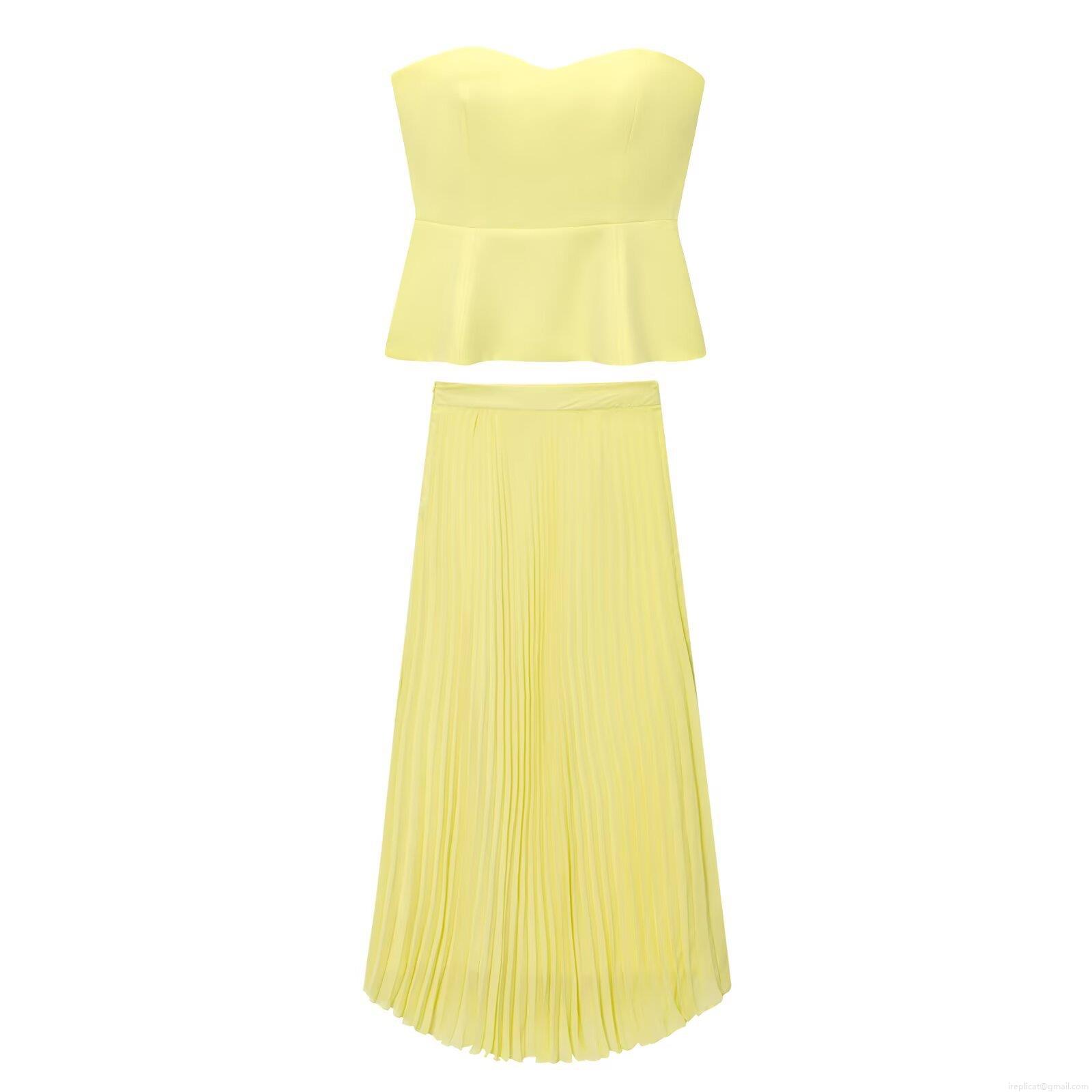 • Women's Yellow Two Piece Set Sexy Strapless Peplum Top And Elegant Pleated Maxi Skirt Casual Vacation Summer Beachwear Outfits Streetwear