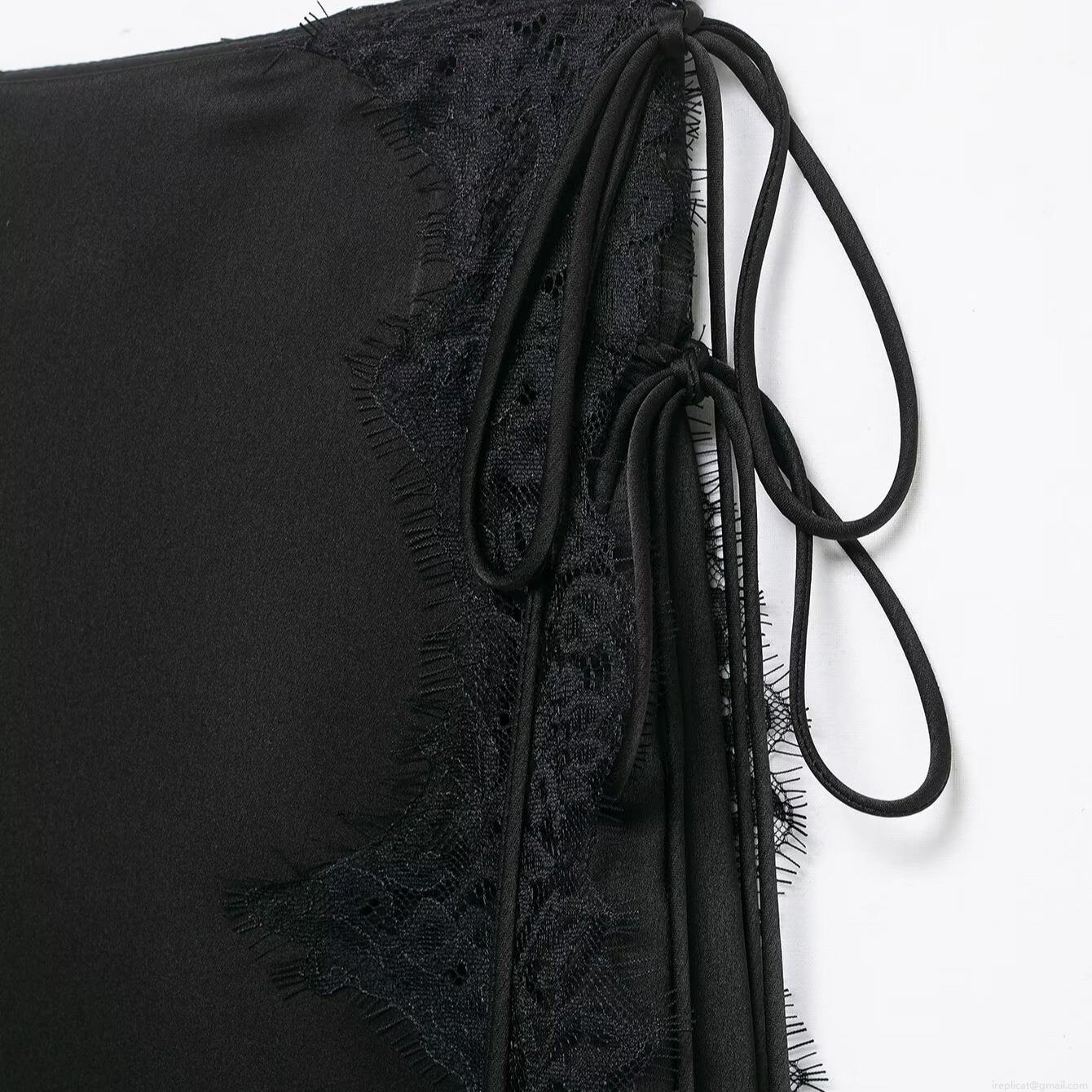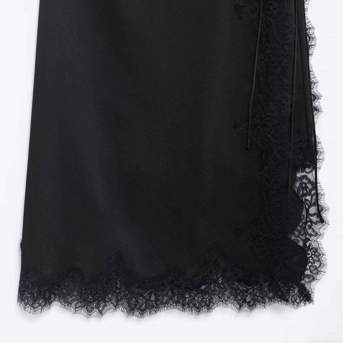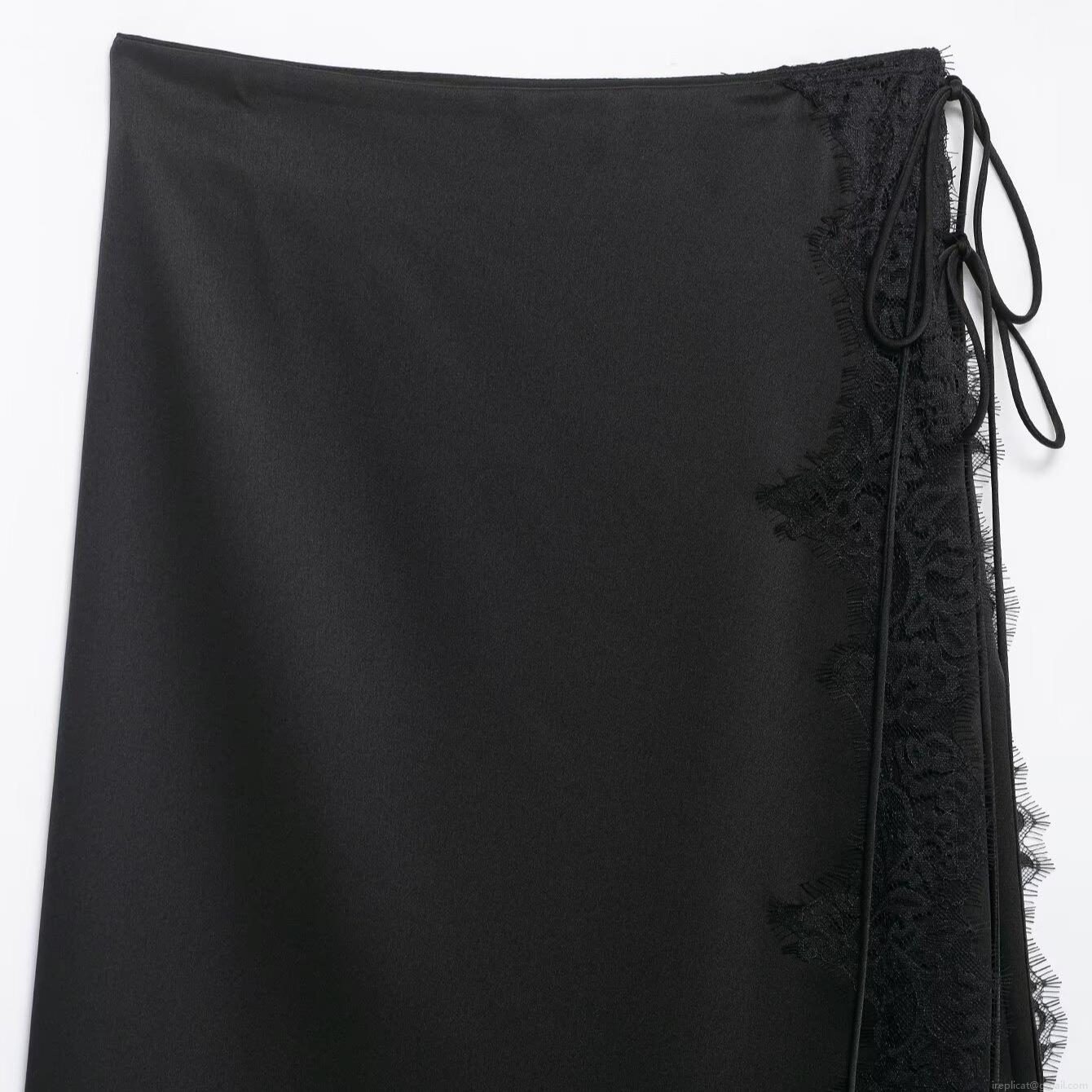 Elegant Black Satin Midi Skirt With Lace Patchwork And Tie Side Wrap Design For Women High Waist Chic Office Party Fashion Silk Feel Skirts