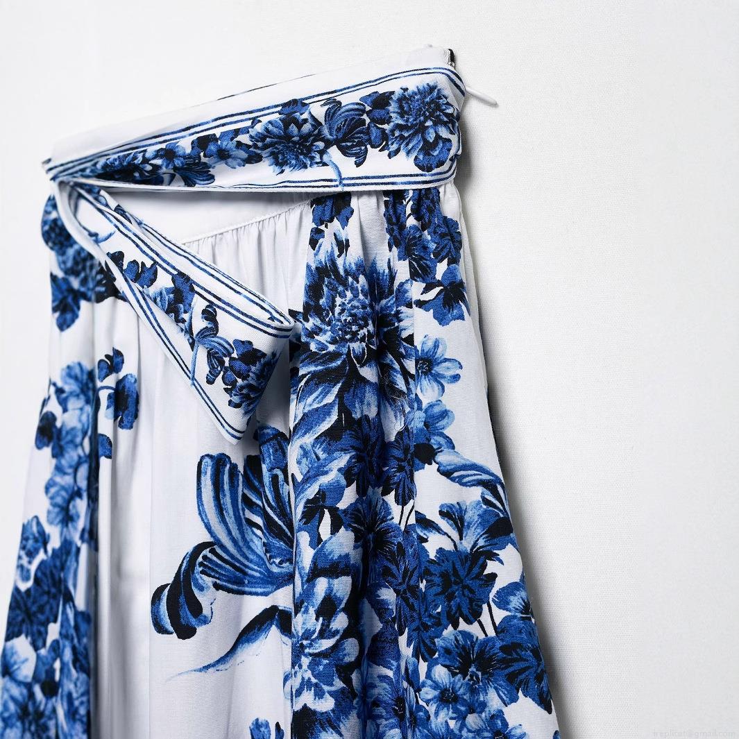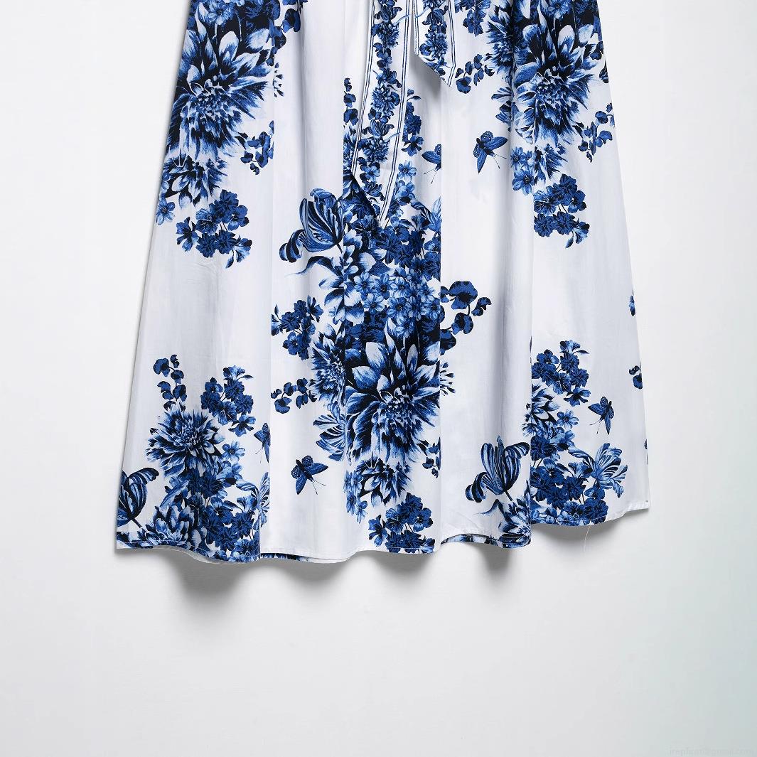 Butterfly, Bow, Floral Pattern, Flowers, Printing, Lace, High-waisted, Side Zipper, Blue And White Porcelain Style