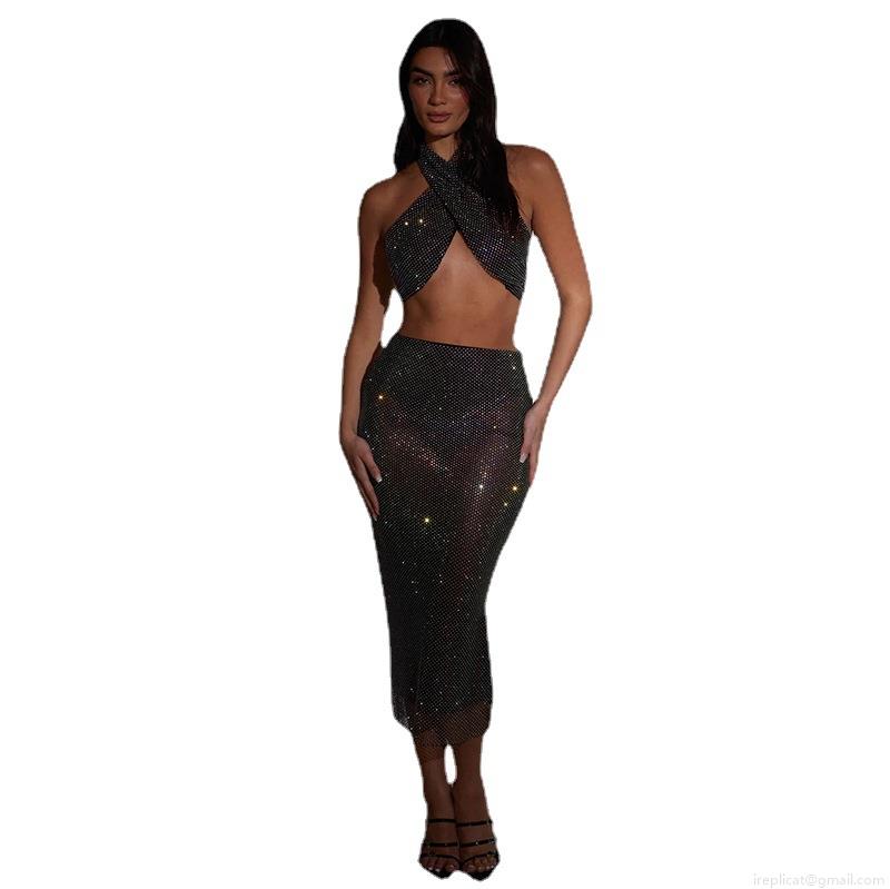 Sexy Women Mesh Rhinestone Bodycon Midi Skirt Polyester See-Through Mesh With Hot-Fix Crystals High Elastic Slim Fit Party Clubwear Evening Wear Street Style