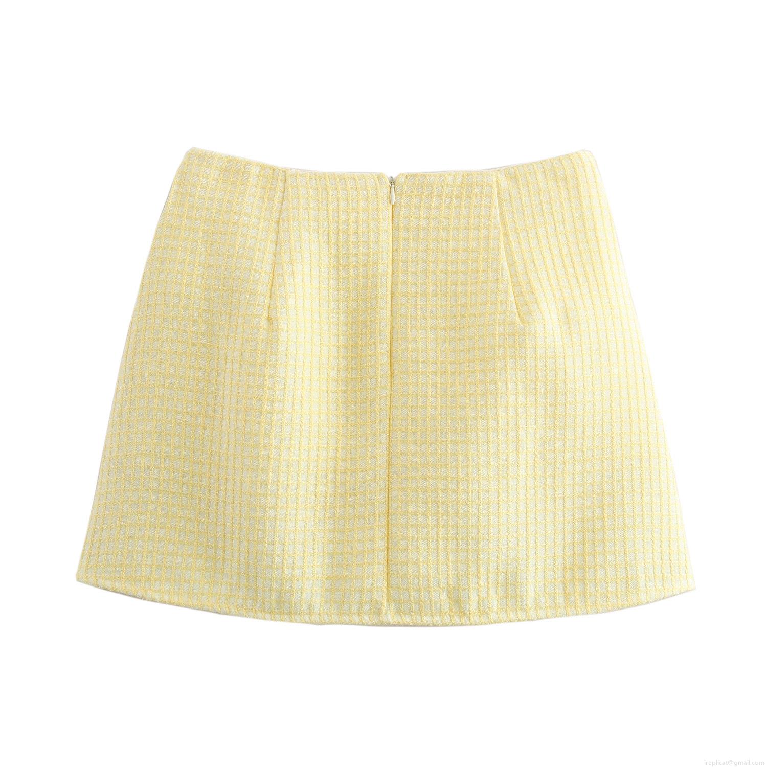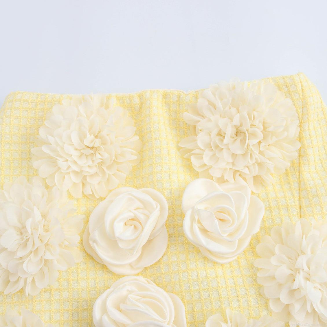 • Sweet Chanel Style Yellow Plaid Tweed Mini Skirt With 3D White Flower Applique Elegant Women Bodycon Short Skirt Evening Party Clothing