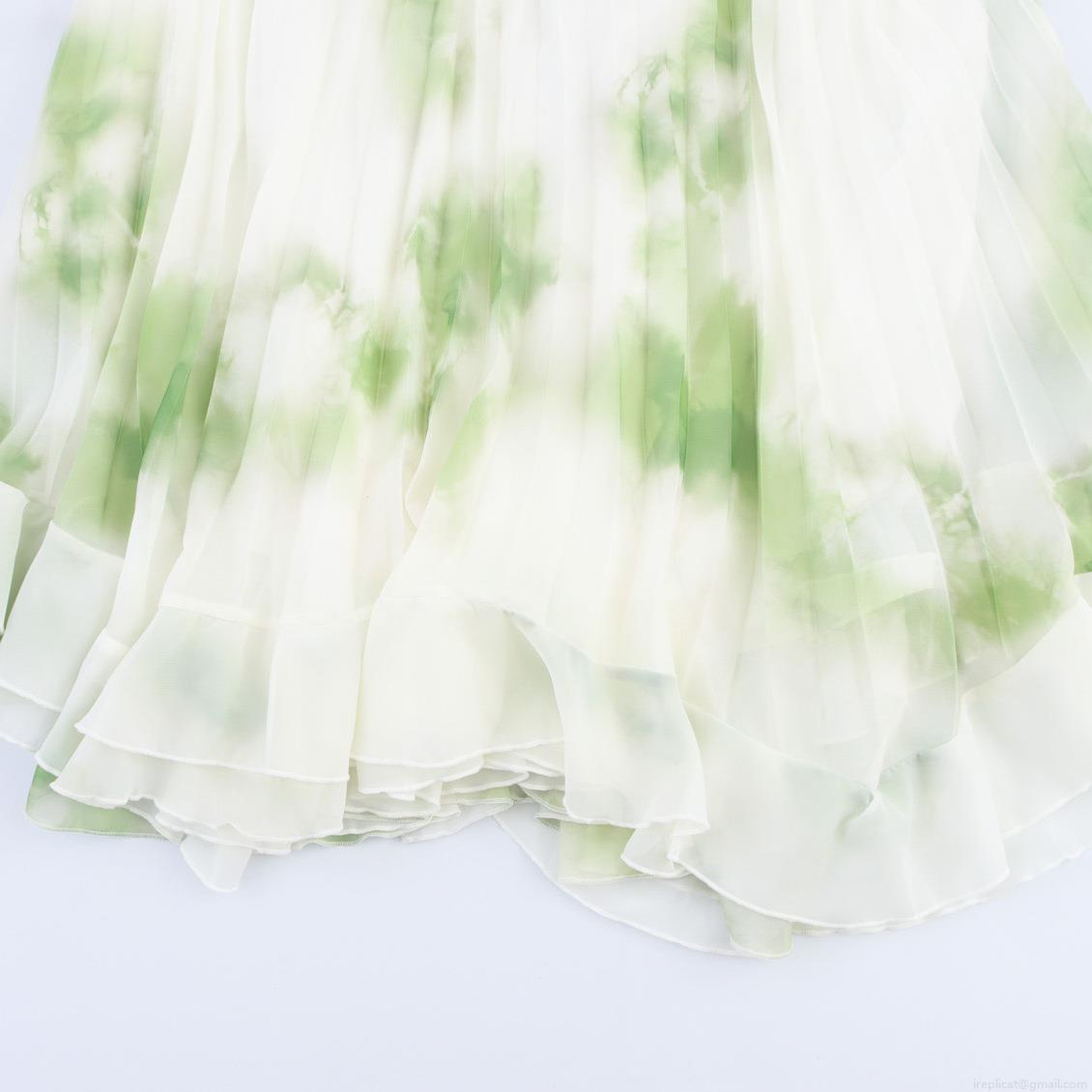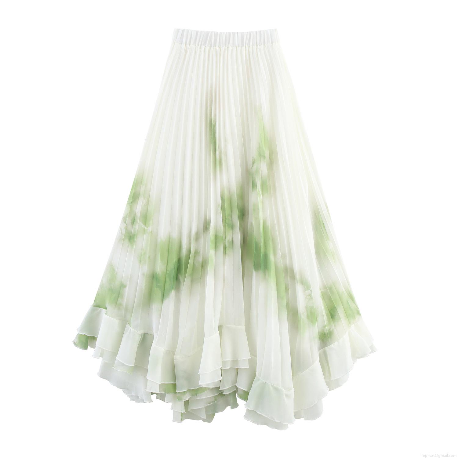 • Women Bohemian Pleated Chiffon Maxi Skirt Elegant Green Ink Wash Print Ruffle Hem Elastic High Waist A-Line Polyester Long Skirt For Summer Vacation Party