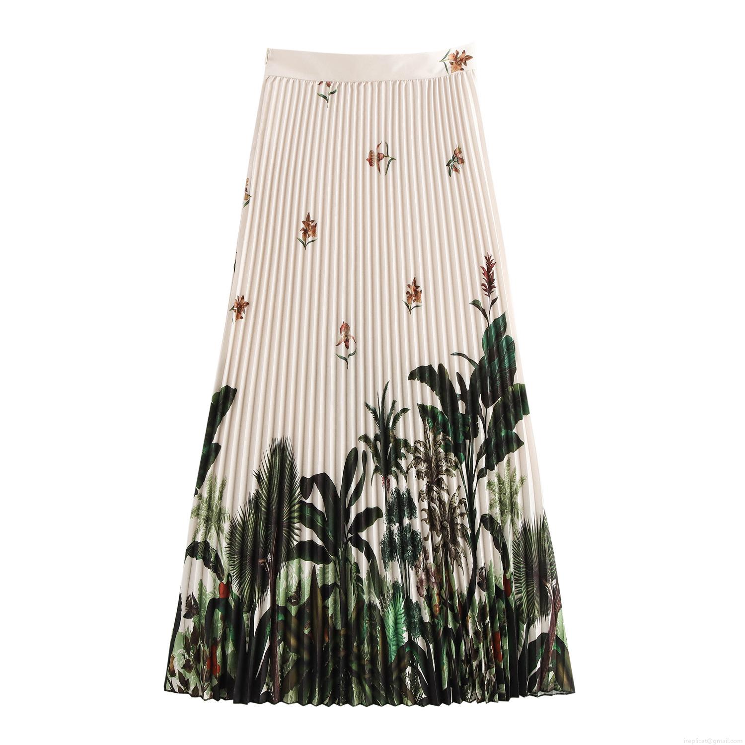 • Women Bohemian Tropical Plant Print Pleated Midi Skirt Polyester High Waist Beach Vacation Long Skirt With Invisible Zipper