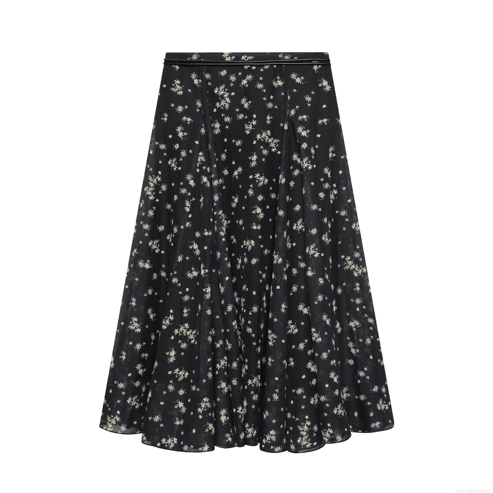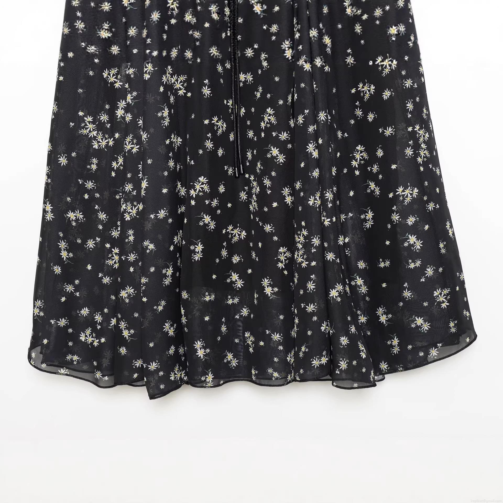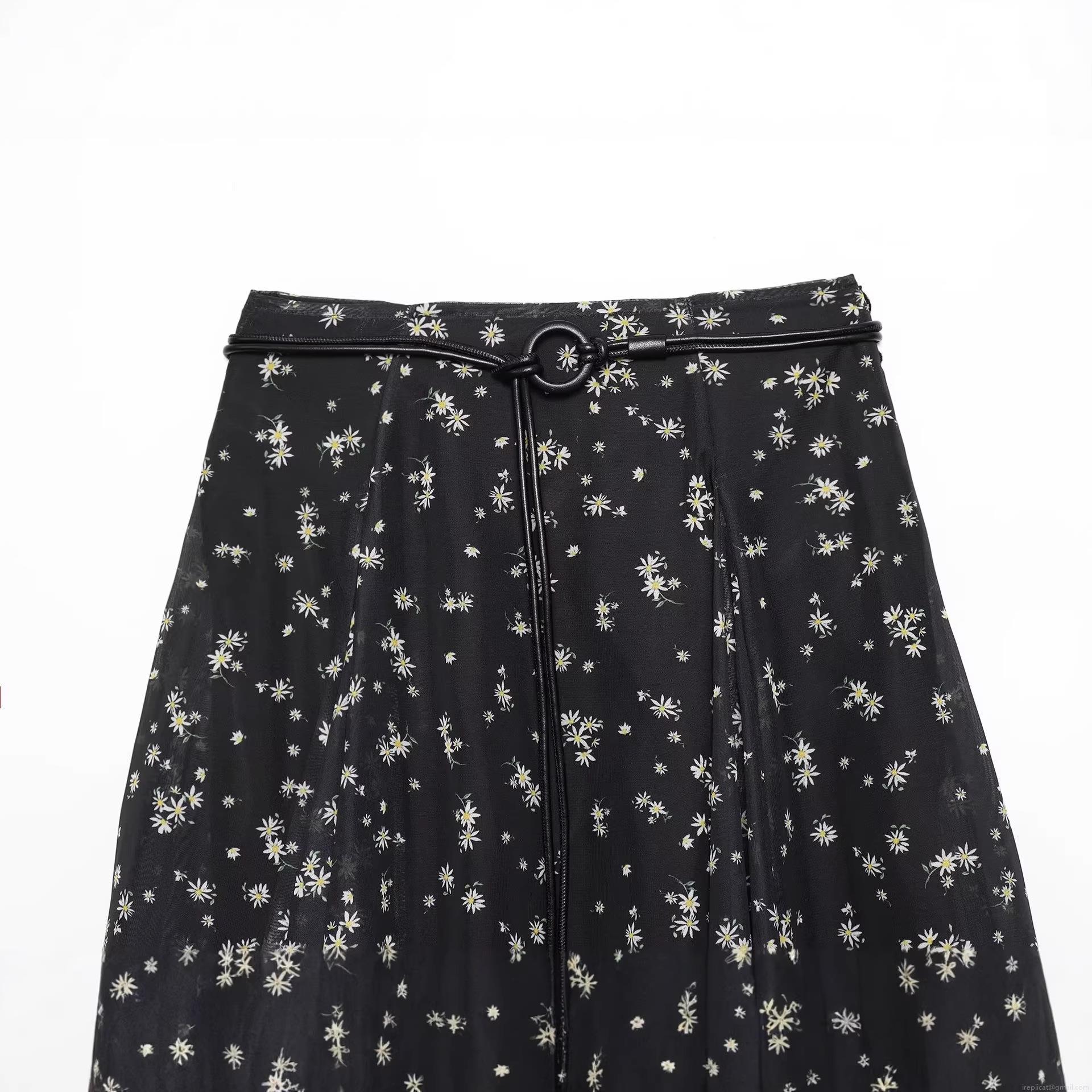 • Women Daisy Print Chiffon Skirt Vintage Black Floral A-Line Pleated Skirt With Belt Summer Casual Holiday Midi Skirt For Women Girls