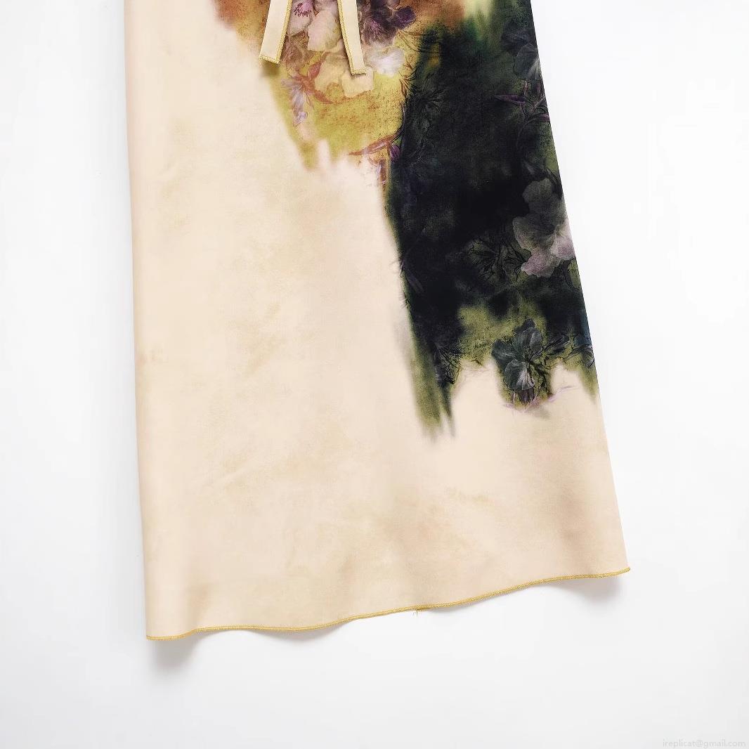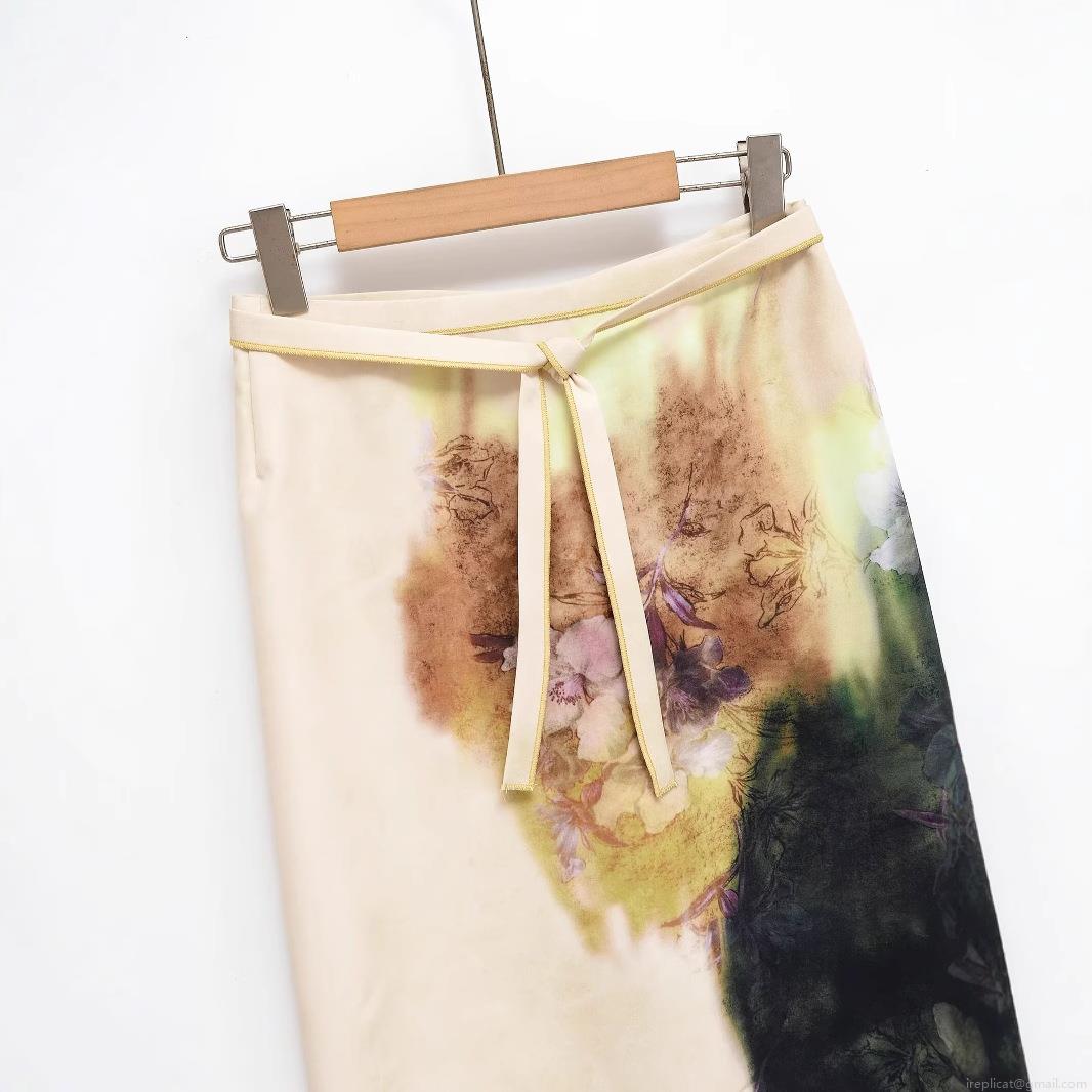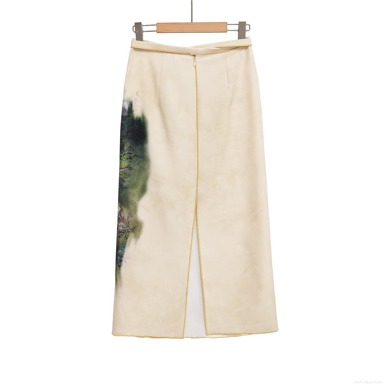 • Women Elegant Art Print Bodycon Midi Skirt High Waist Side Slit Long Skirt With Tie Waist Sexy Street Style Beige Polyester Skirt For Casual Vacation