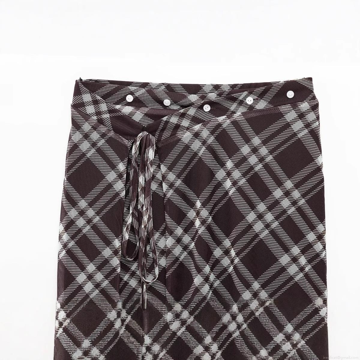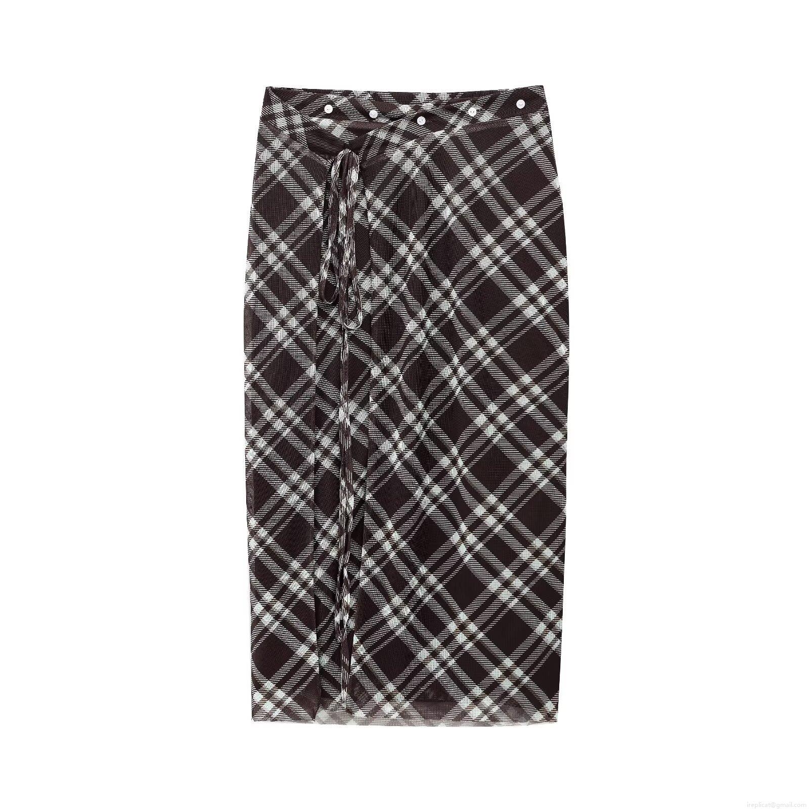 Women Plaid Mesh Sarong Skirt Sexy High Waist Bodycon Midi Skirt With Buttons And Tie Casual Streetwear Long Skirt Brown White Checkered Wrap Skirt