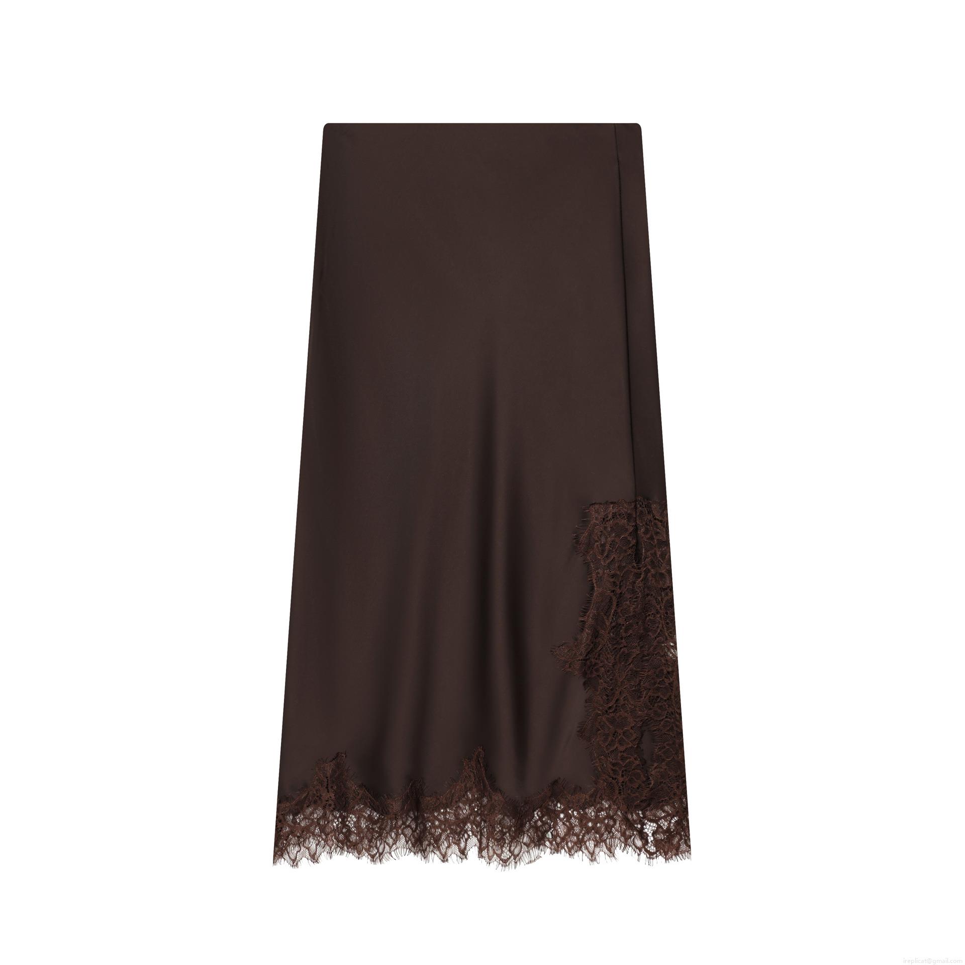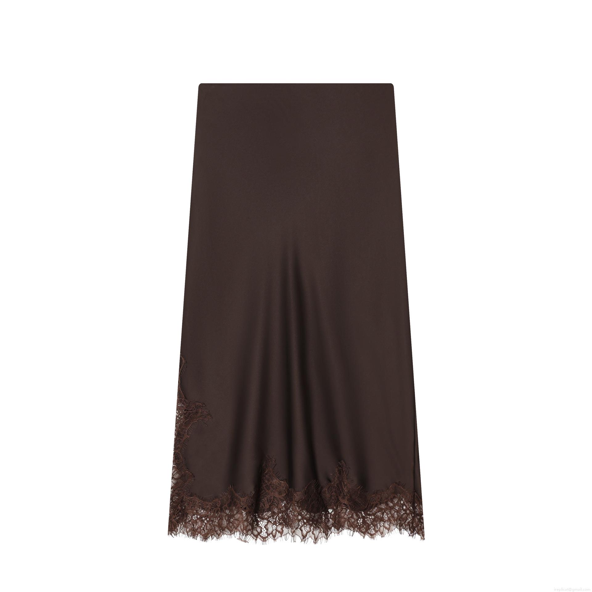 Women Satin Lace Patchwork Midi Skirt Elegant High Waist Silk Feeling Straight Pencil Skirt for Party Date Streetwear