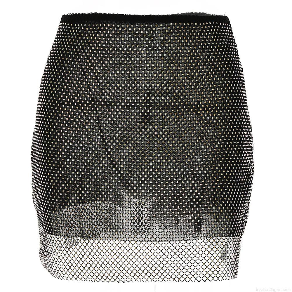 • Women Sexy Rhinestone Mesh Mini Skirt Sparkly See Through Bodycon Skirt For Nightclub Party Summer High Waist Black Polyester Skirt