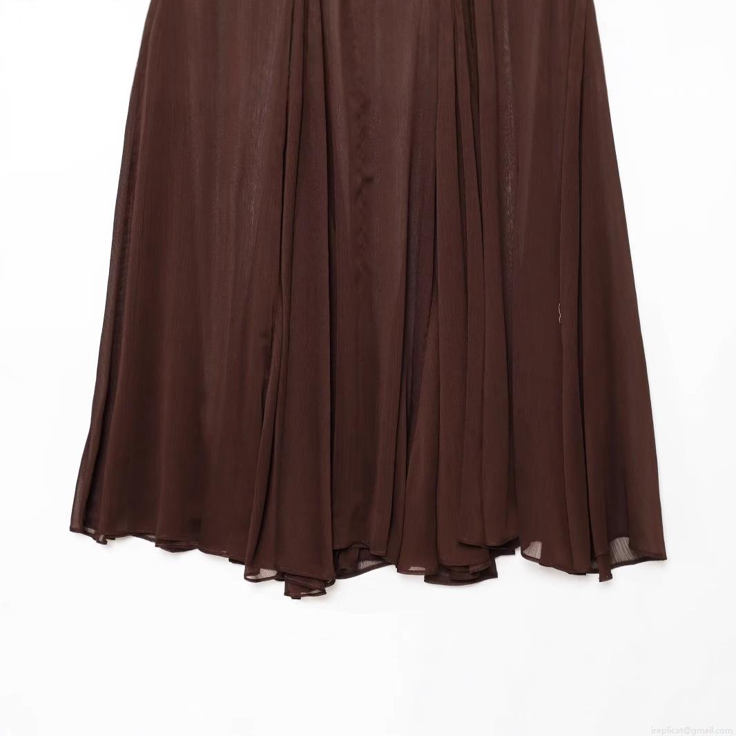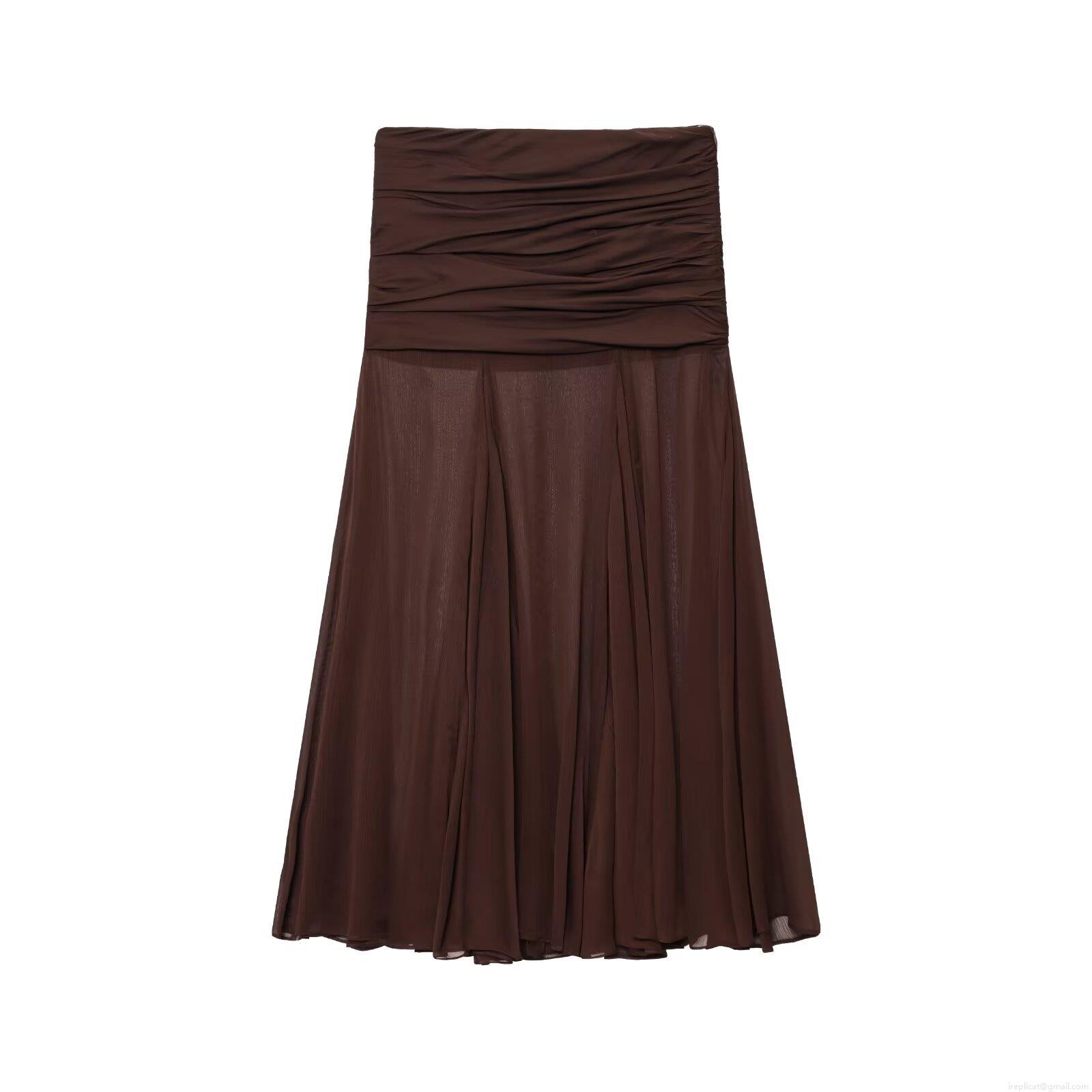 • Women Sexy Ruched Chiffon Maxi Skirt Semi-Transparent Bodycon High Waist Pleated Long Skirt for Street Clubwear Party Dark Brown
