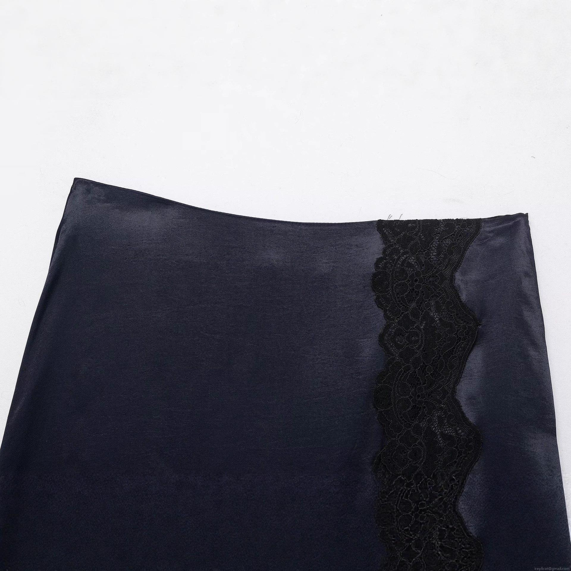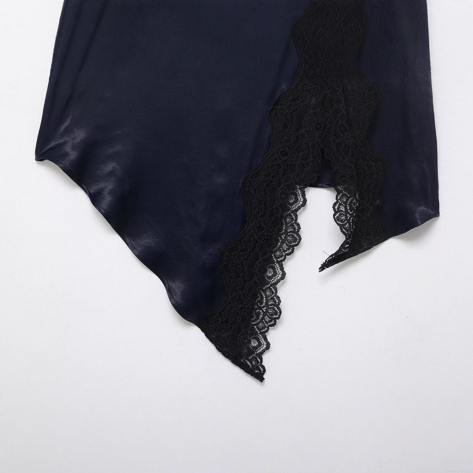 • Women Sexy Satin Asymmetrical Mini Skirt With Lace Patchwork Elegant Navy Blue Silky High Waist Short Skirt For Party Club Evening Fashion Streetwear