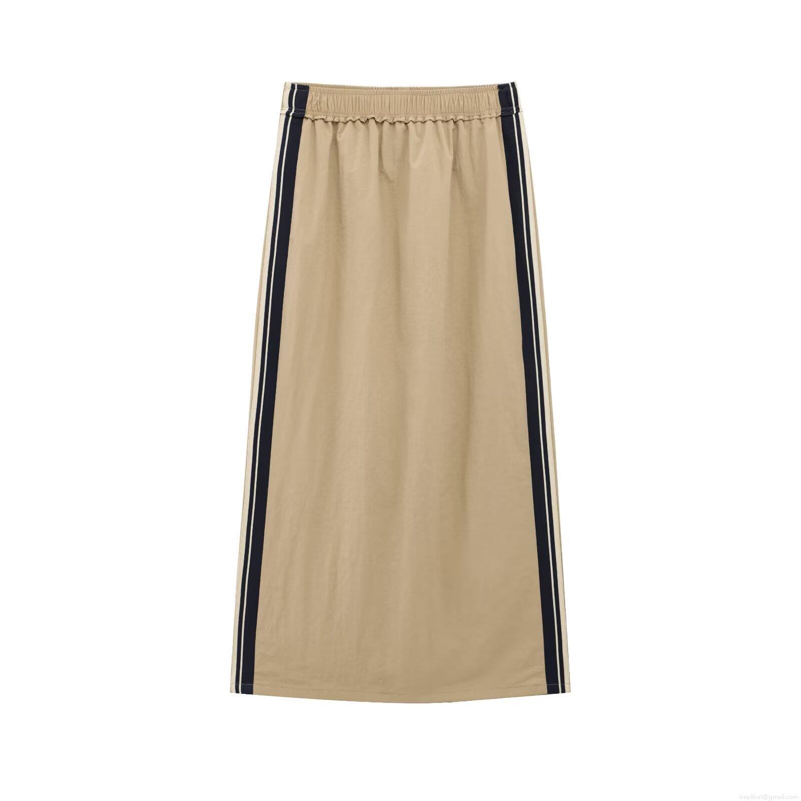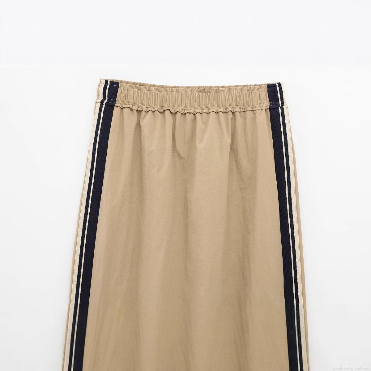 Solid Color, Color-blocked Stripes, Elastic Waistband, Ruffled Waistband, Rear Split, Side Stripe Decoration